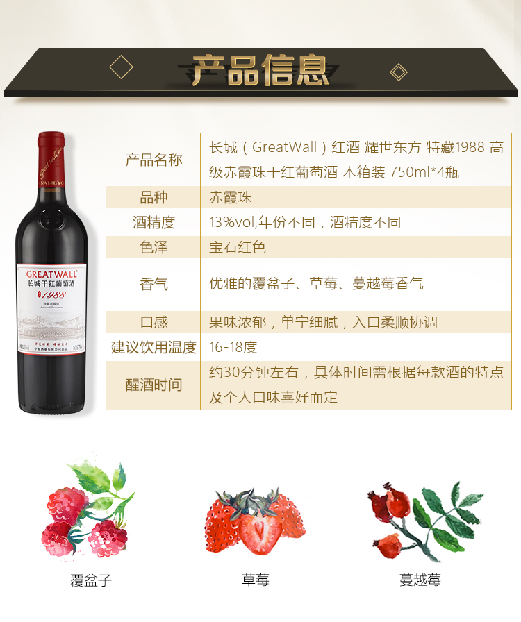 颜色:宝石红;口感:饱满;特性:精品葡萄酒;国产/进口:国产;适用场景:家庭聚会,礼节拜访,商务宴请,婚礼婚宴,情侣约会,自斟自饮,派对活动;包装:整箱装;酸度:中酸;类别:红葡萄酒;葡萄品种:赤霞珠(Cabernet Sauvignon);类型:静止酒;香型:果香;产地:中国大陆;容量:750mL;甜度:干型;系列:特藏;保质期:3650天;酒精度:12.5vol;原产地:中国大陆;存储方法:避免阳光直射,于5℃~25℃干燥通风处卧放或倒放为宜;容量:3000ml;产品重量:10kg;包装清单:长城(GreatWall)红酒 耀世东方 特藏1988 高级赤霞珠干红葡萄酒 木箱装 750ml*4瓶*1箱;