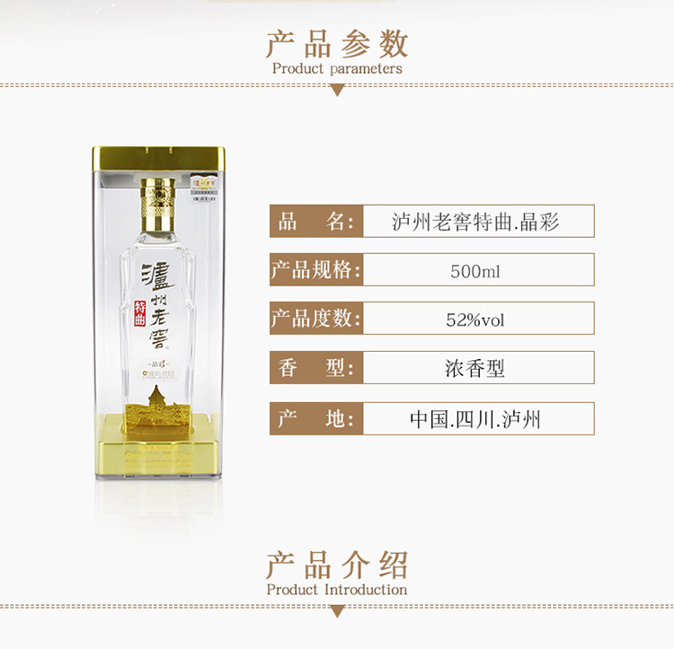 包装:瓶装;容量:376-499mL;香型:浓香型;产地:四川;度数:50度及以上;酒精度:52%vol;容量:500ml;产品重量:1770g;包装清单:500ml;