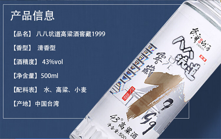包装:整箱装;容量:500-749mL;香型:清香型;产地:中国台湾;度数:40-49度;酒精度:43%vol;容量:500;产品重量:500g;包装清单:台湾八八坑道高粱酒 窖藏1999 43度整箱装 500ml*4瓶*1;