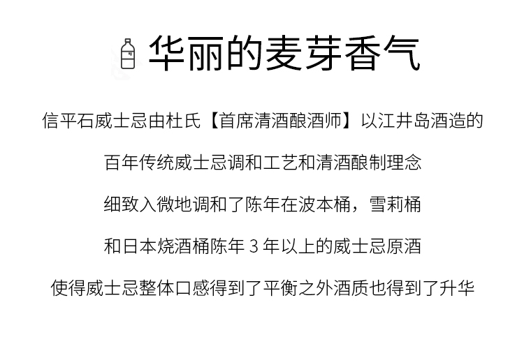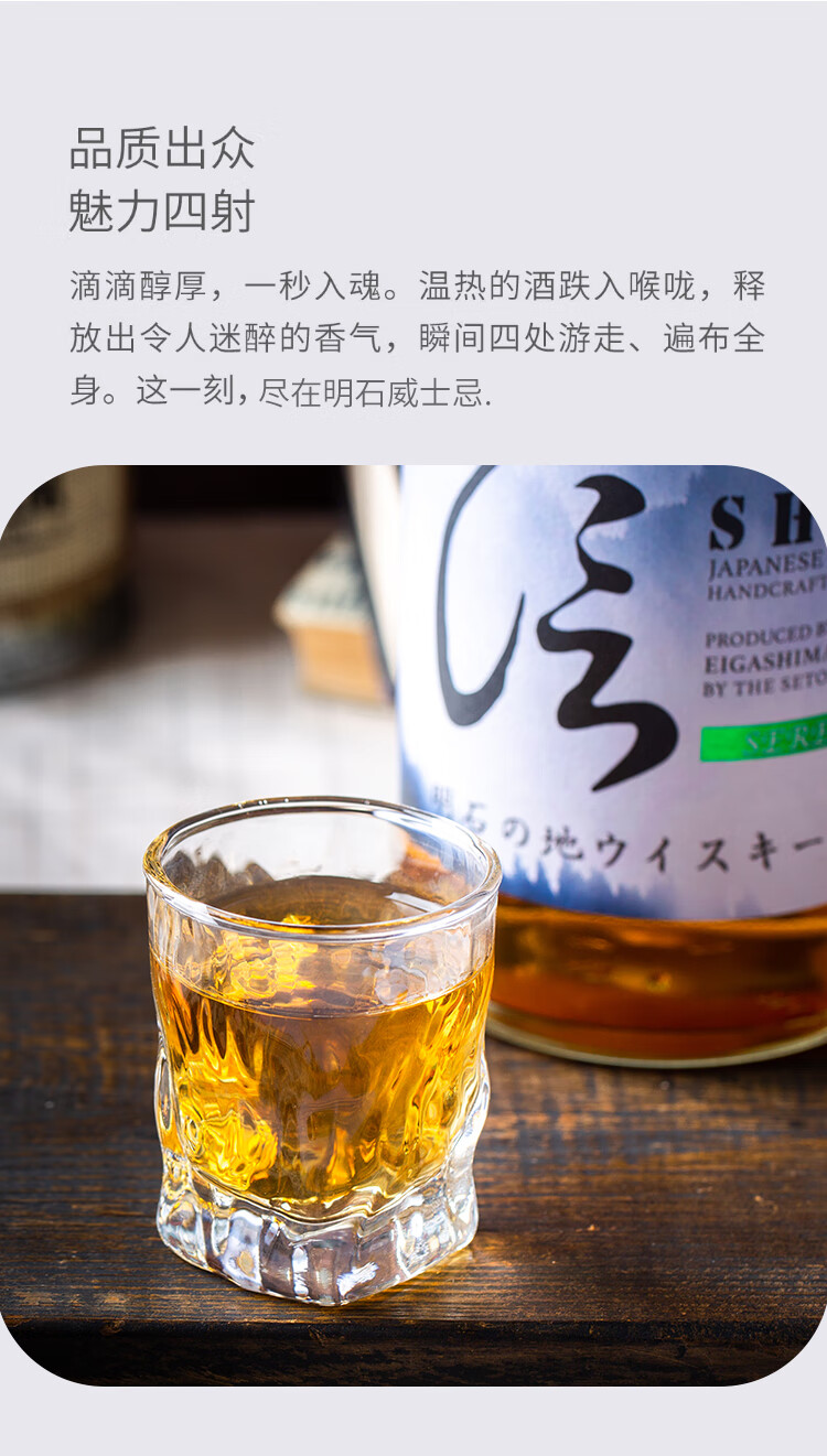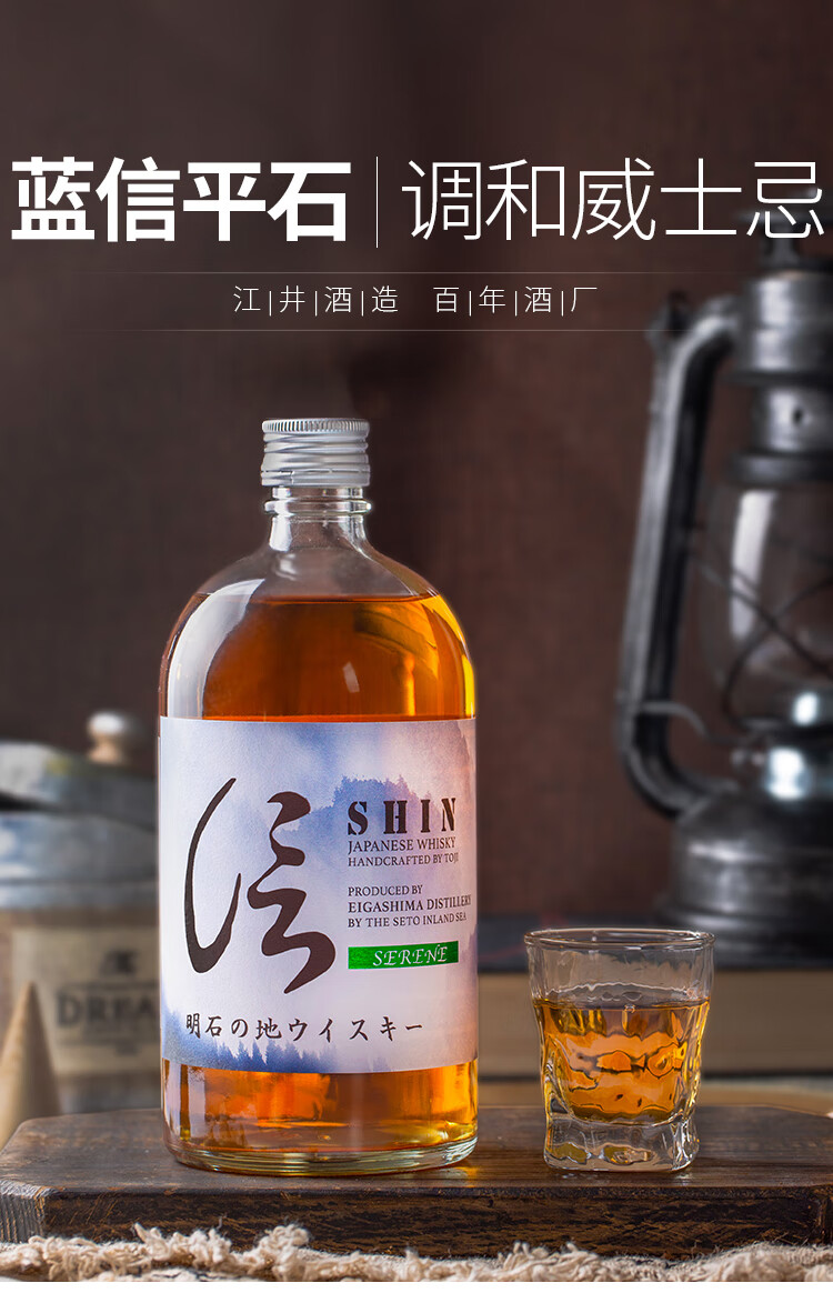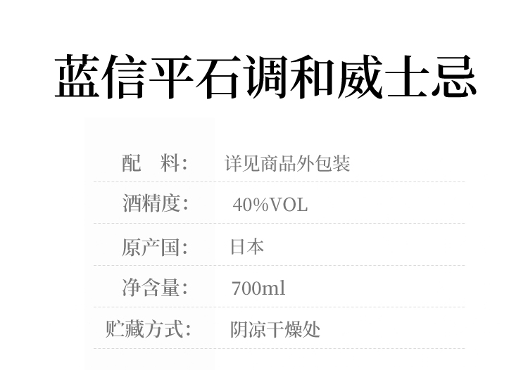类型:调和威士忌;产地:日本;适用场景:自斟自饮,亲友馈赠,家庭聚会,商务宴请,情侣约会,闺蜜私语;包装:礼盒装;容量:700-999mL;阶段:小白入门;原料:水,麦芽,玉米;保质期:无;酒精度:40%vol;存储方法:阴凉干燥处;产品重量:0.7kg;容量:700mL;包装清单:信明石蓝信调和威士忌700ml;
