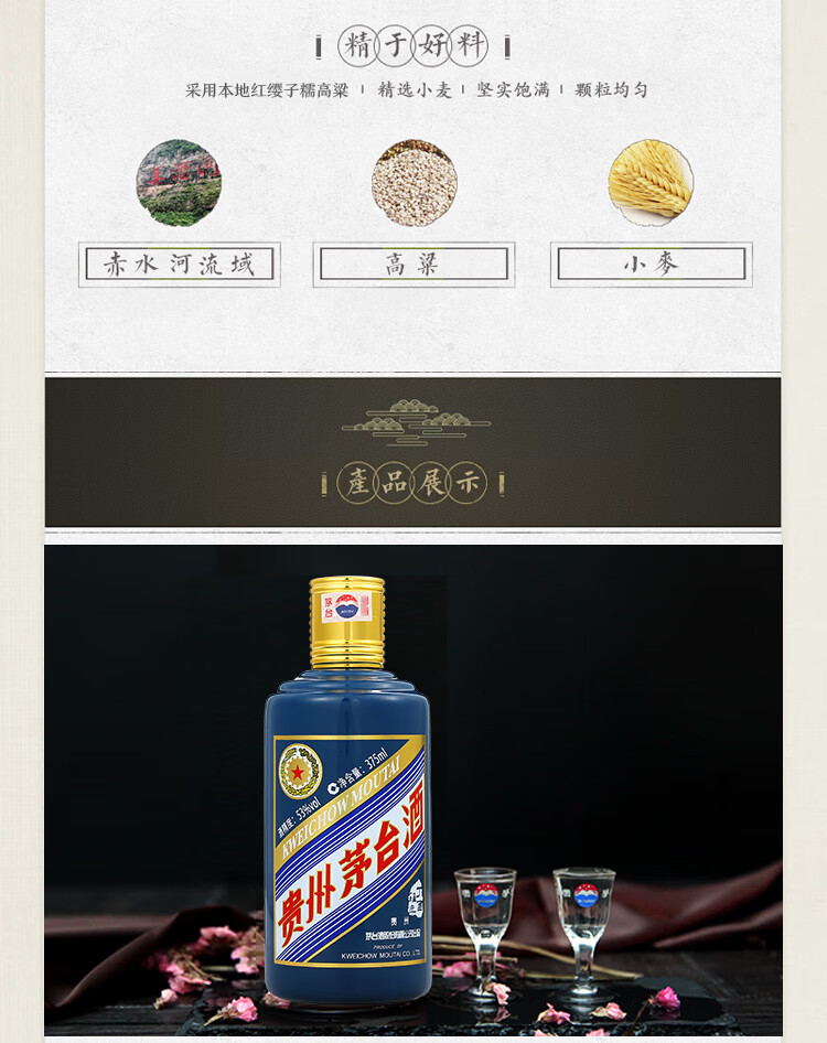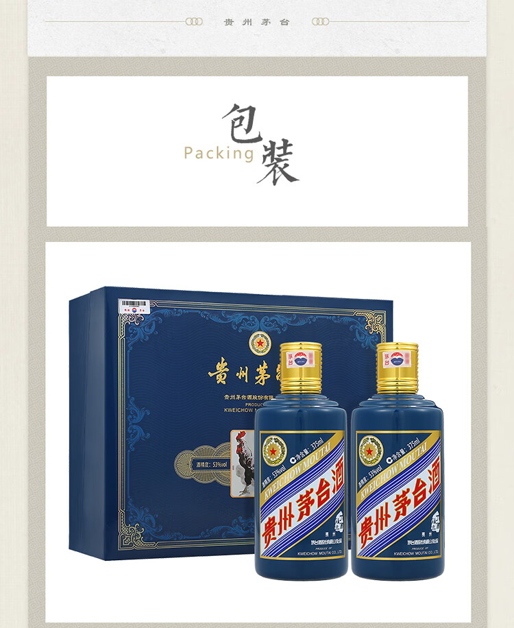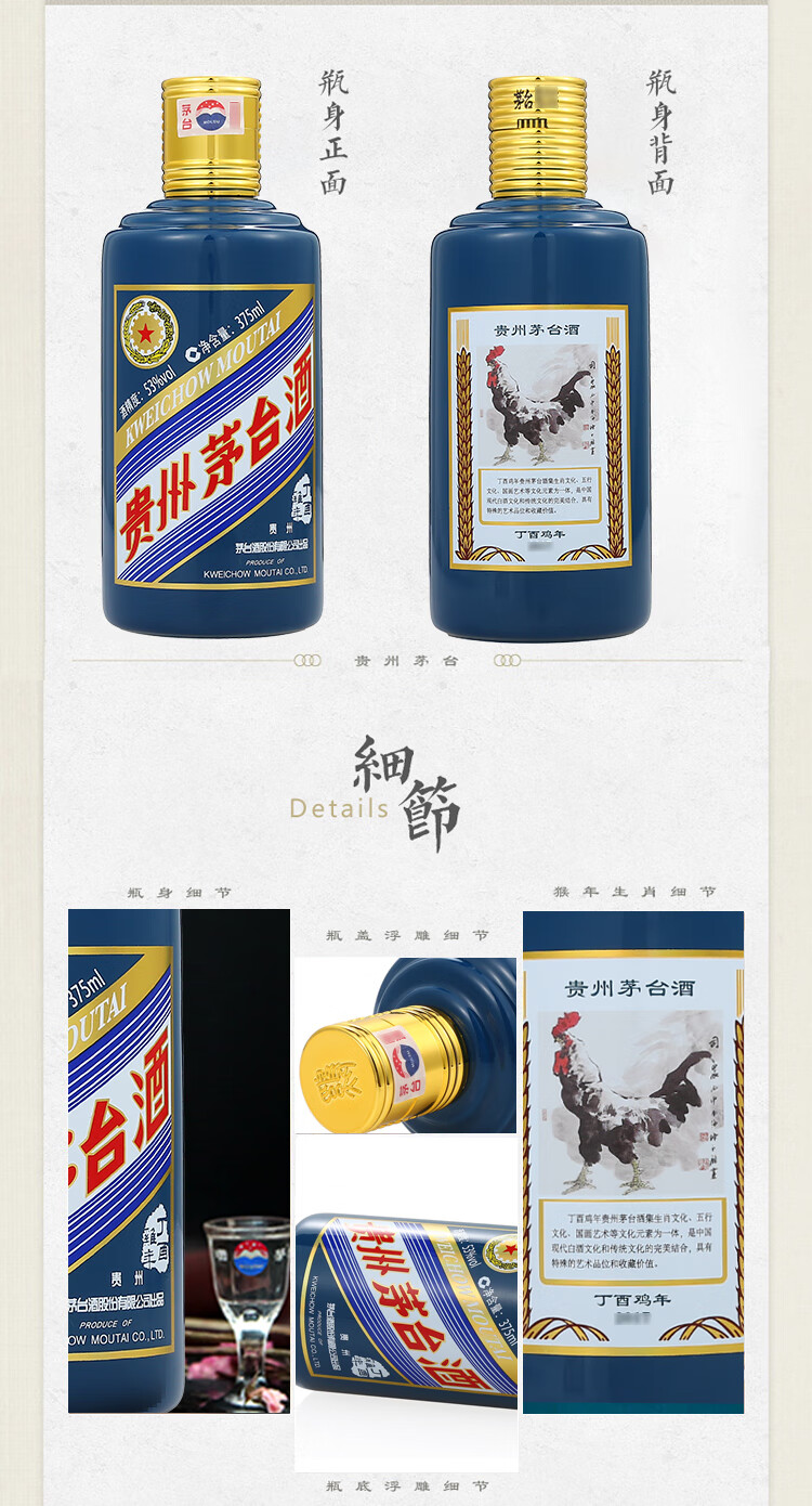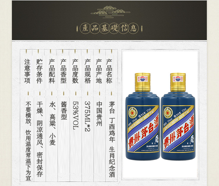 包装:礼盒装;容量:375mL及以下;香型:酱香型;产地:贵州;度数:50度及以上;酒精度:53%vol;容量:375ml;产品重量:750g;包装清单:茅台生肖纪念酒 丁酉鸡年 375ml*2瓶 礼盒装;