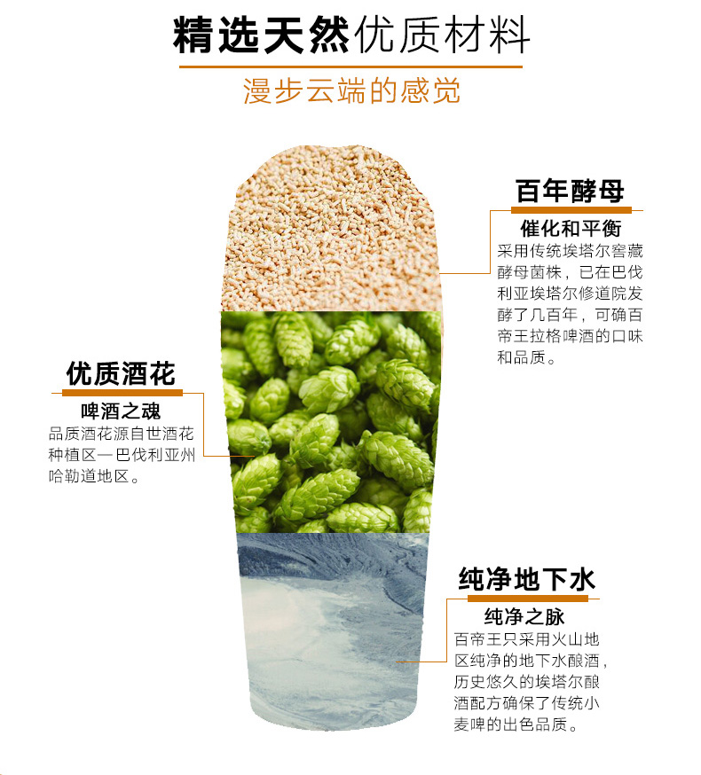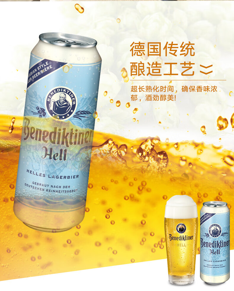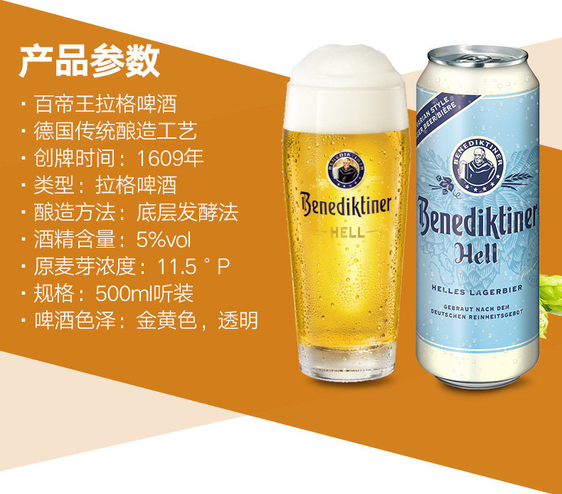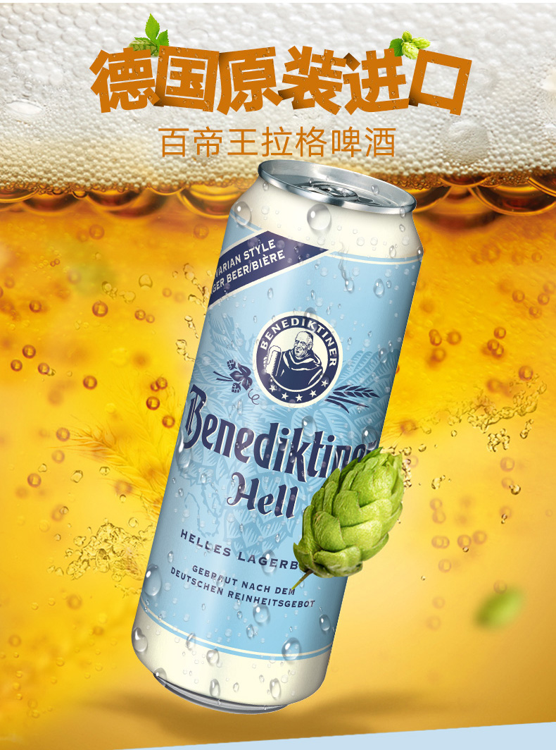 国产/进口:进口;产地:德国;适用场景:野餐出游,礼节拜访,家庭聚会,自斟自饮,情侣约会,烧烤撸串,派对必备,酒吧夜店;包装:听装;容量:500mL;类别:黄啤酒;原料:水、大麦麦芽、啤酒花;保质期:12个月;酒精度:5;原产地:德国;原麦汁浓度:12.5°p;存储方法:常温存放于阴凉干燥处;产品重量:12kg;容量:500ml*24;包装清单:百帝王拉格啤酒500ml*24听整箱装;