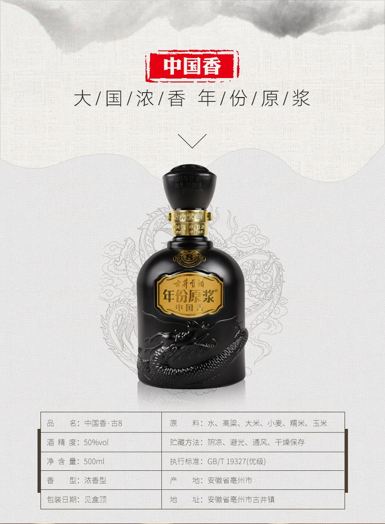 包装:瓶装;容量:376-499mL;香型:浓香型;产地:安徽;度数:50度及以上;酒精度:50%vol;容量:500;产品重量:0g;包装清单:古井贡酒中国香 古8 50度 单瓶装白酒500ml *1;