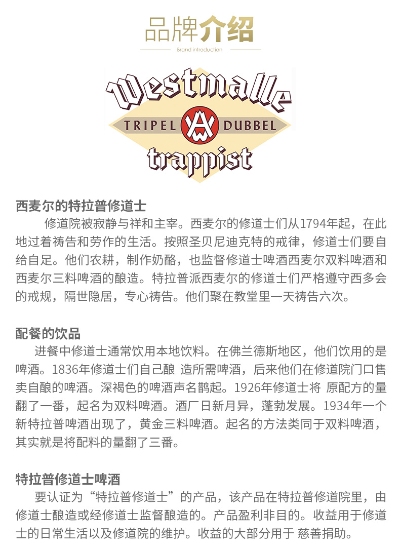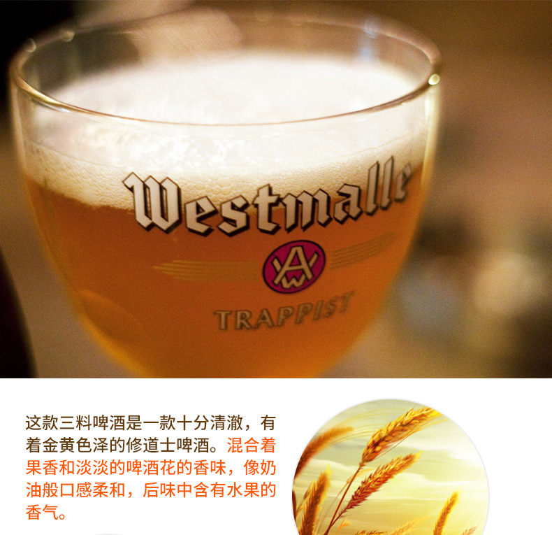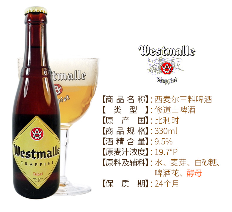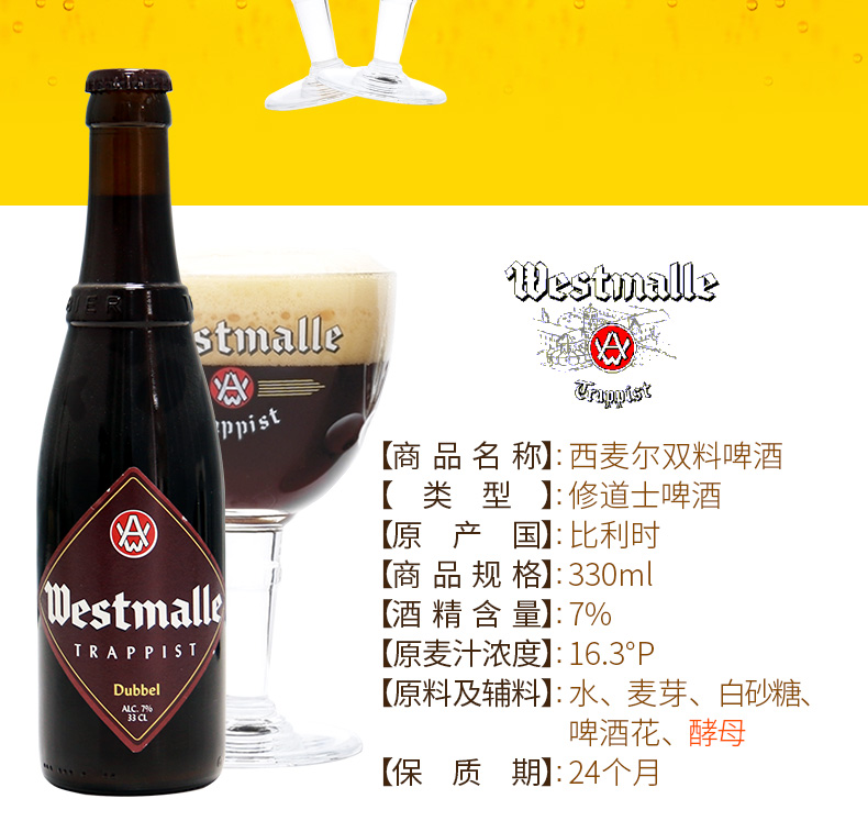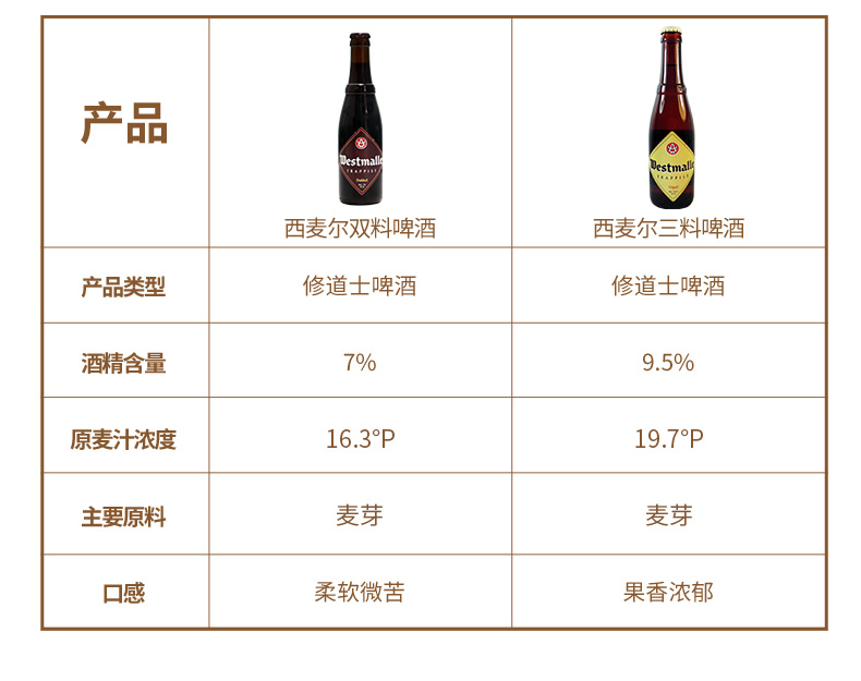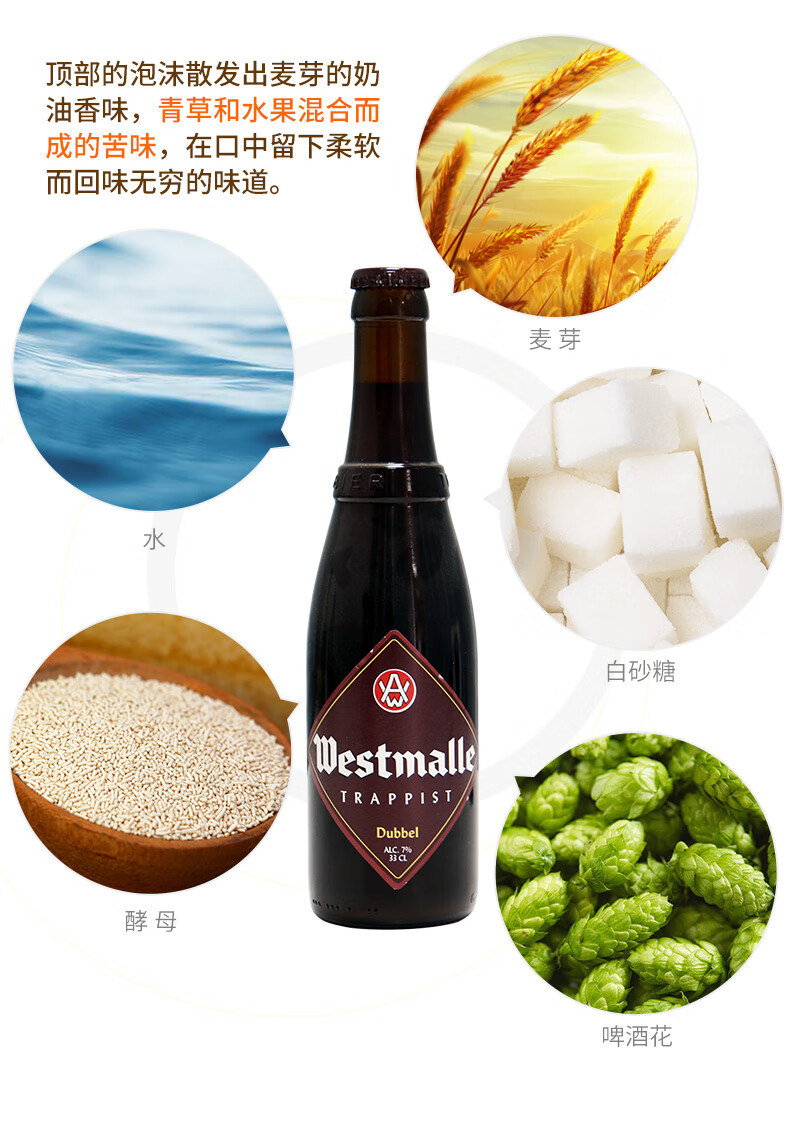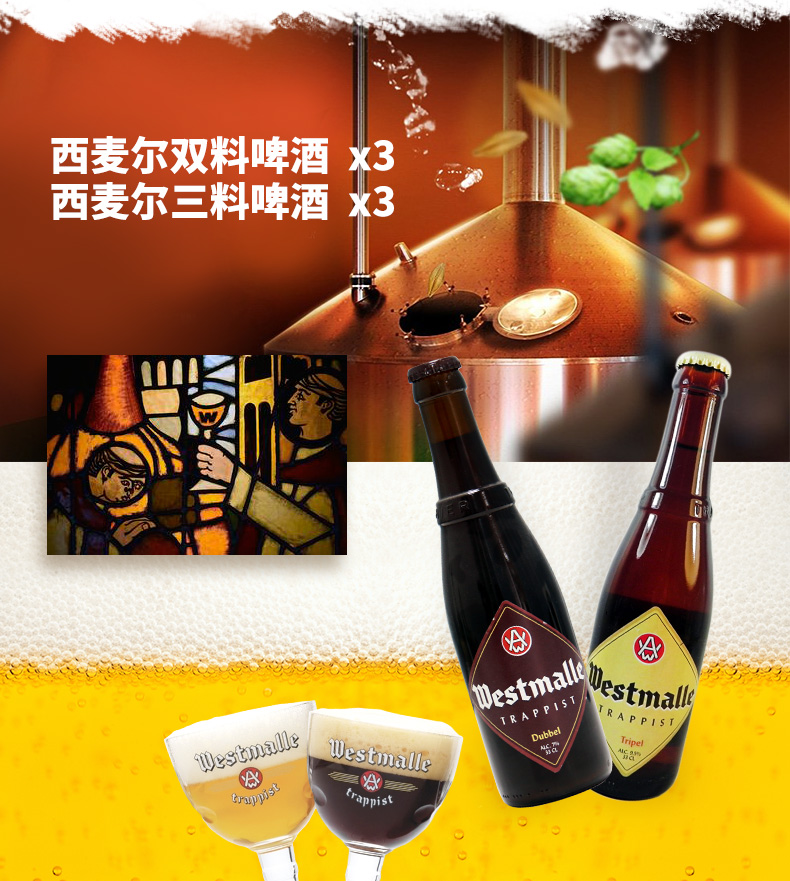 国产/进口:进口;产地:比利时;适用场景:礼节拜访,家庭聚会,自斟自饮,情侣约会,烧烤撸串,派对必备,酒吧夜店;包装:组合装;容量:330mL以下;类别:精酿;原料:水、大麦芽、白砂糖、啤酒花、酵母;保质期:2年;酒精度:7;原产地:比利时;原麦汁浓度:16.3-19.7;存储方法:存放于阴凉干燥处,冷藏后饮用更佳;产品重量:3.5kg;容量:330ml;包装清单:西麦尔 双料*3/三料*3啤酒 组合装 330ml*6瓶x1;