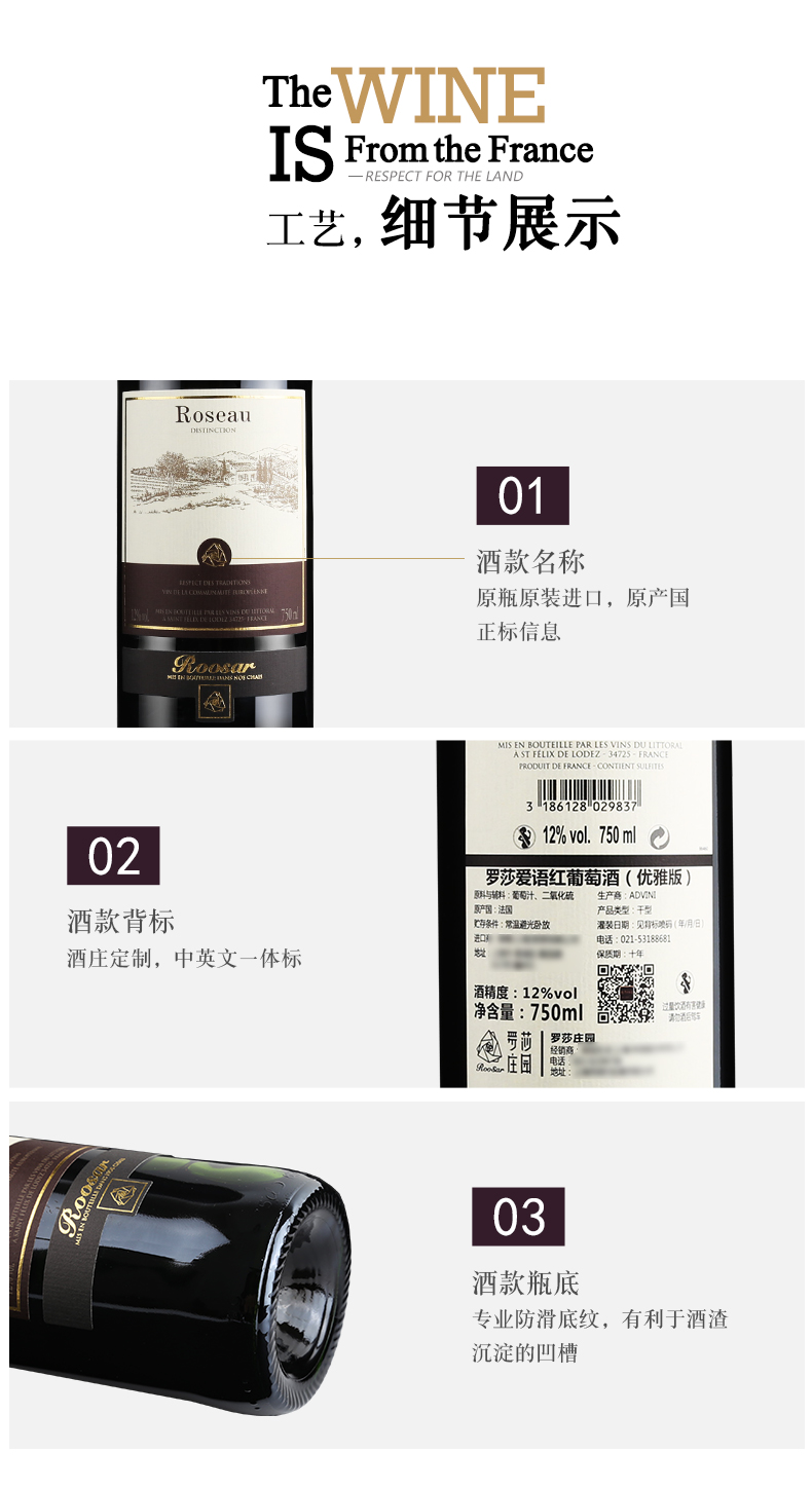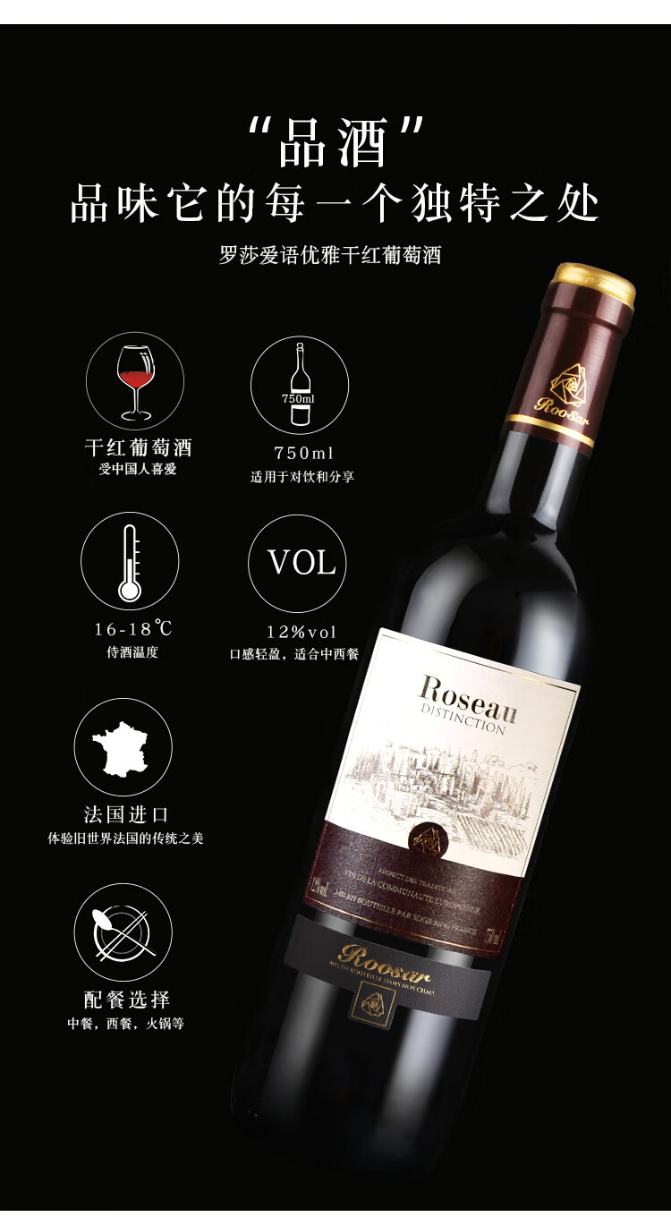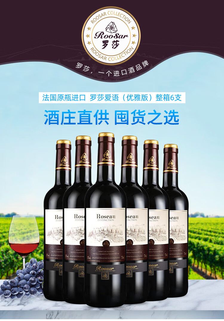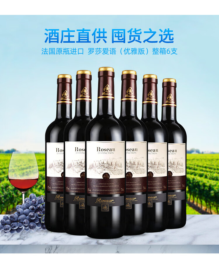 颜色:宝石红;口感:柔和;特性:普通餐酒;国产/进口:进口;适用场景:礼节拜访,商务宴请,婚礼婚宴,情侣约会,家庭聚会,自斟自饮,闺蜜私语,派对活动;包装:整箱装;酸度:低酸;类别:红葡萄酒;葡萄品种:其它;类型:静止酒;香型:果香;产地:法国;容量:750mL;甜度:干型;保质期:10年;酒精度:12%vol;原产地:法国;存储方法:恒温、静卧、斜放、避光;容量:750ml;产品重量:9kg;包装清单:罗莎爱语(优雅版)红葡萄酒750ml*6;