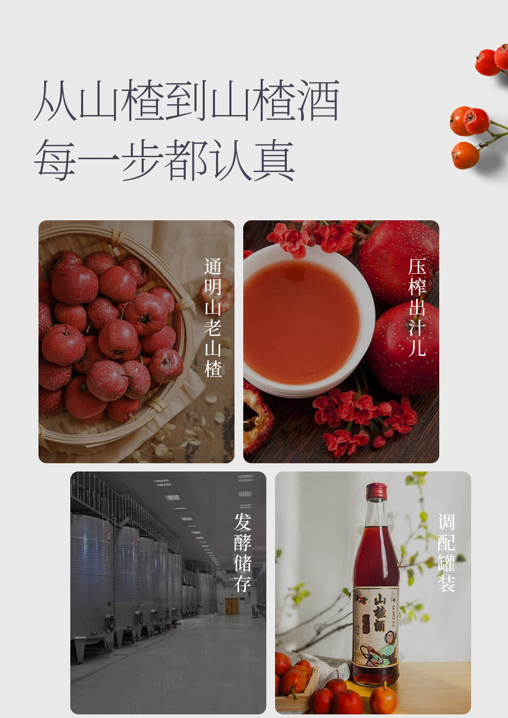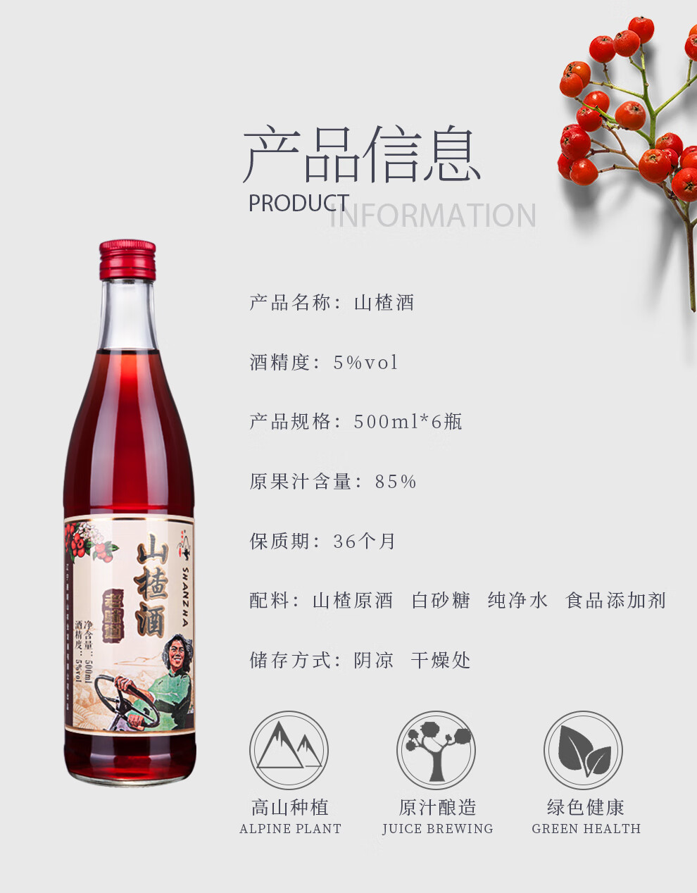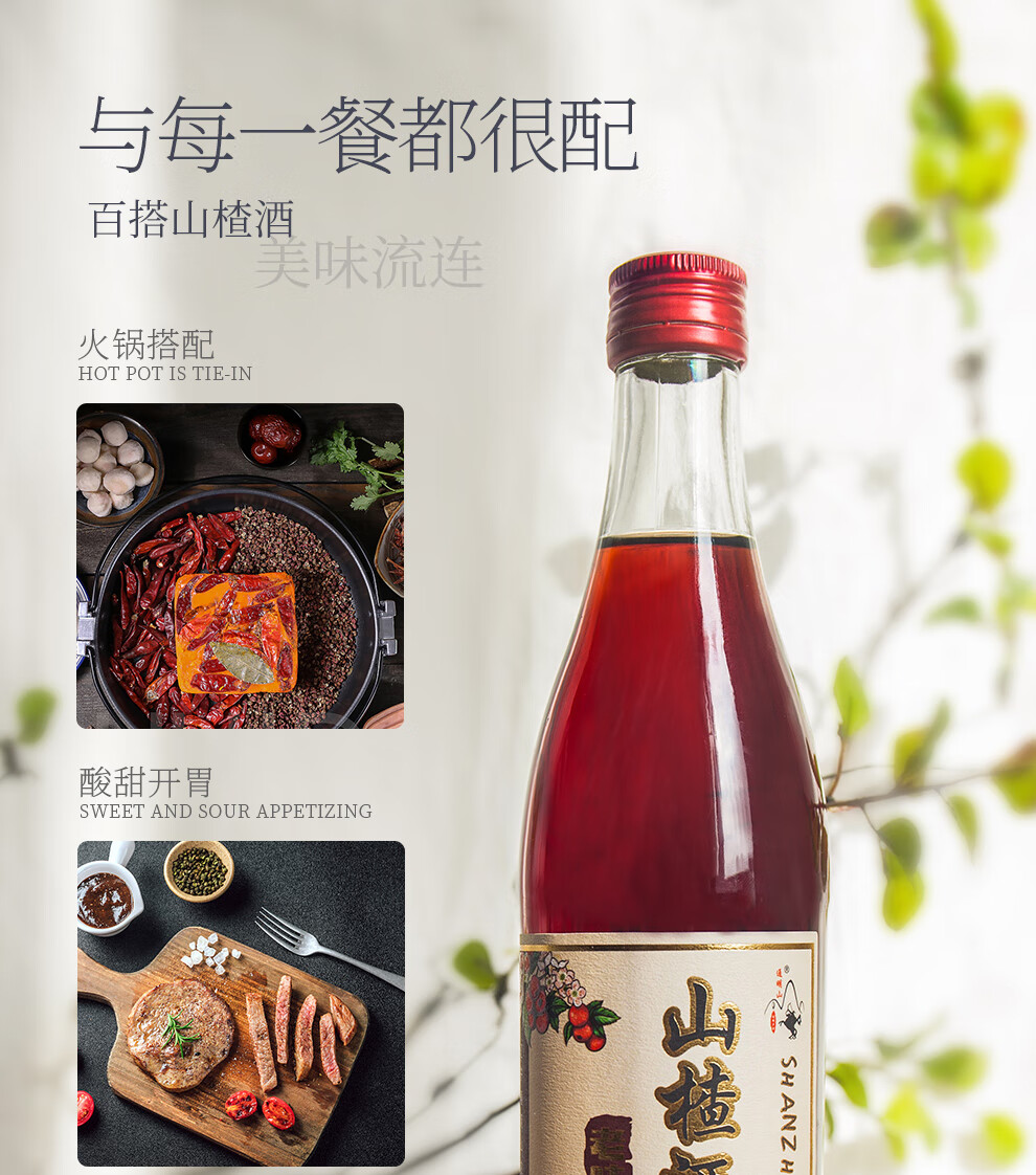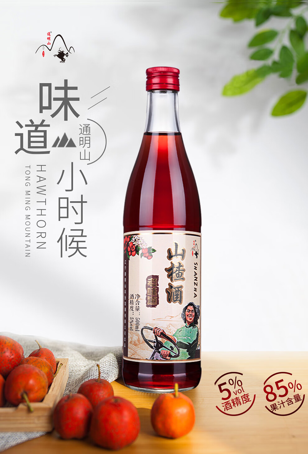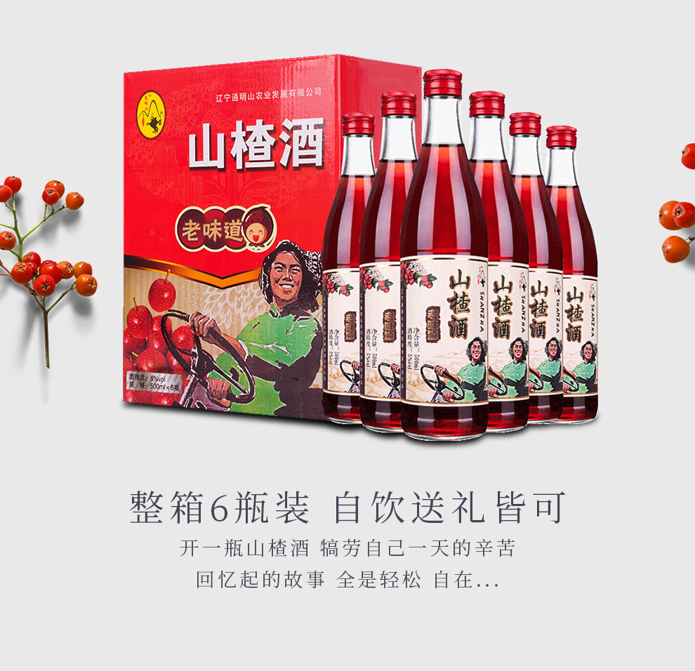 颜色:砖红色;口感:香甜;特性:普通餐酒;国产/进口:国产;适用场景:礼节拜访,婚礼婚宴,家庭聚会,自斟自饮,闺蜜私语;包装:整箱装;酸度:低酸;类别:果味葡萄酒;葡萄品种:其它;类型:其它;香型:果香;产地:中国大陆;容量:376-749mL;甜度:甜型;保质期:1095天;酒精度:5%vol;原产地:中国大陆;存储方法:常温避光;容量:500Ml;产品重量:0.02kg;包装清单:山楂酒500ml*6瓶;