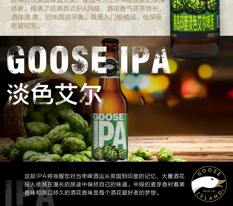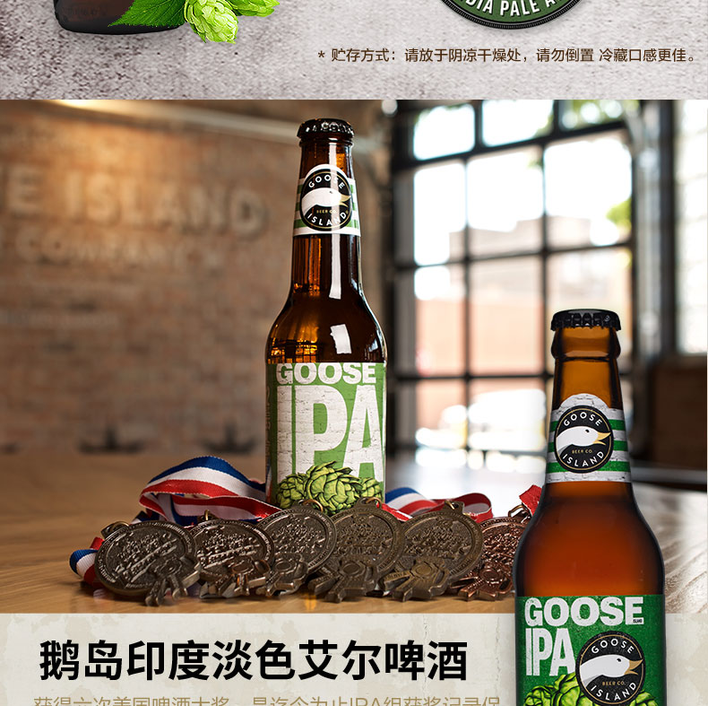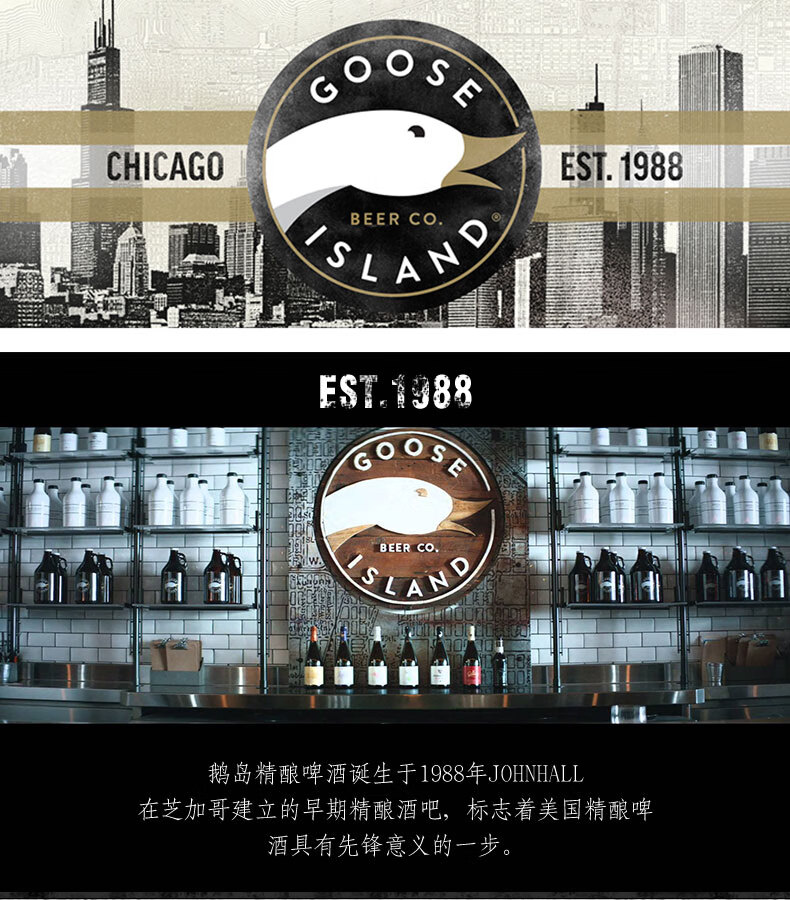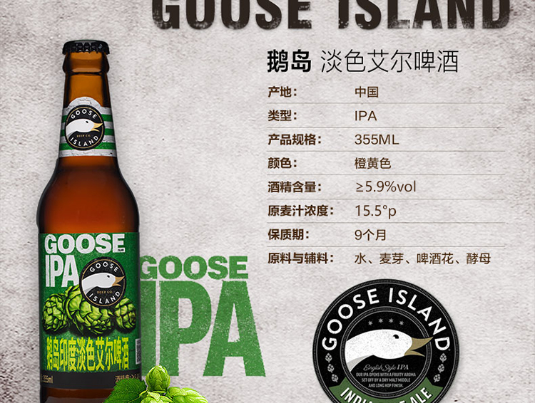 国产/进口:国产;产地:中国大陆;适用场景:家庭聚会,礼节拜访,情侣约会,自斟自饮,派对必备,烧烤撸串,酒吧夜店;包装:瓶装;容量:331-499mL;类别:精酿;原料:水、麦芽、啤酒花、酵母;国产/进口:国产;保质期:9个月;酒精度:≥5.9%vol;原产地:中国大陆;原麦汁浓度:15.5°P;存储方法:存放于阴凉干燥处;类别:精酿;包装:瓶装;产品重量:15.5kg;容量:355ml;包装清单:鹅岛啤酒(Goose Island)IPA印度淡色艾尔啤酒355ml*24瓶装;
