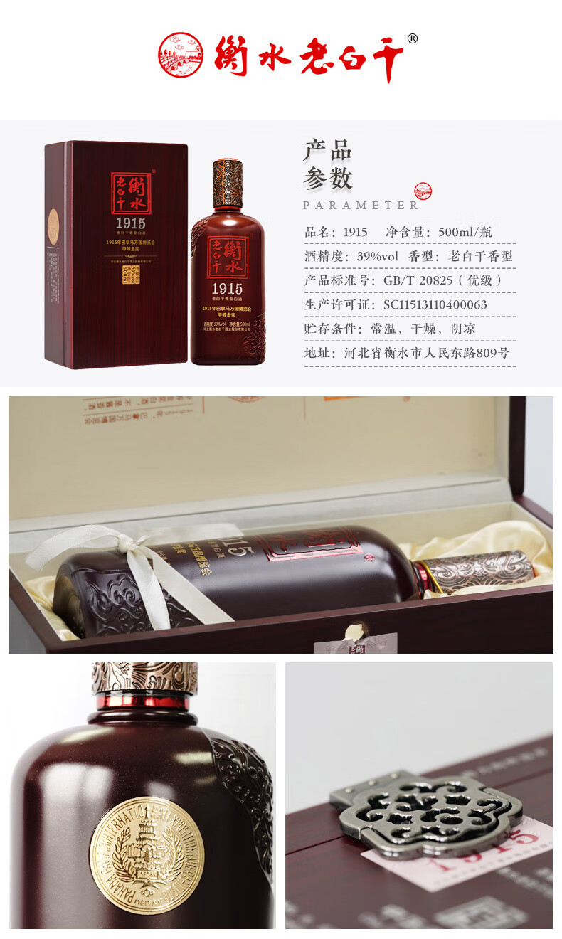 包装:瓶装;容量:500-749mL;香型:老白干香型;度数:35-39度;香型:老白干香型;产地:河北;酒精度:39%vol;包装:礼盒装;产品重量:1200g;容量:500ml;包装清单:衡水老白干 白酒 1915 老白干香型 39度 500ml;