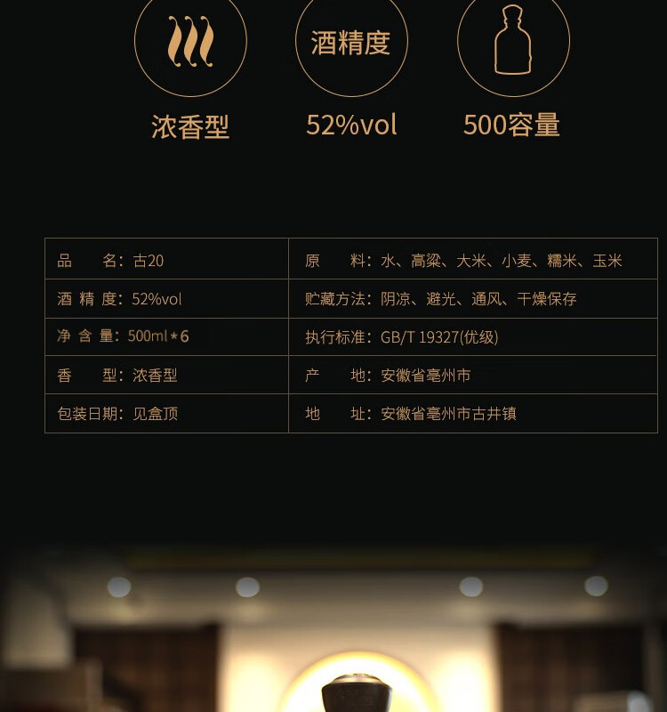 包装:整箱装;容量:500-749mL;香型:浓香型;产地:安徽;度数:50度及以上;酒精度:52%vol;容量:500;产品重量:0g;包装清单:古井贡酒中国香古20 52度 整箱装白酒500ml*6瓶 礼品袋*3;