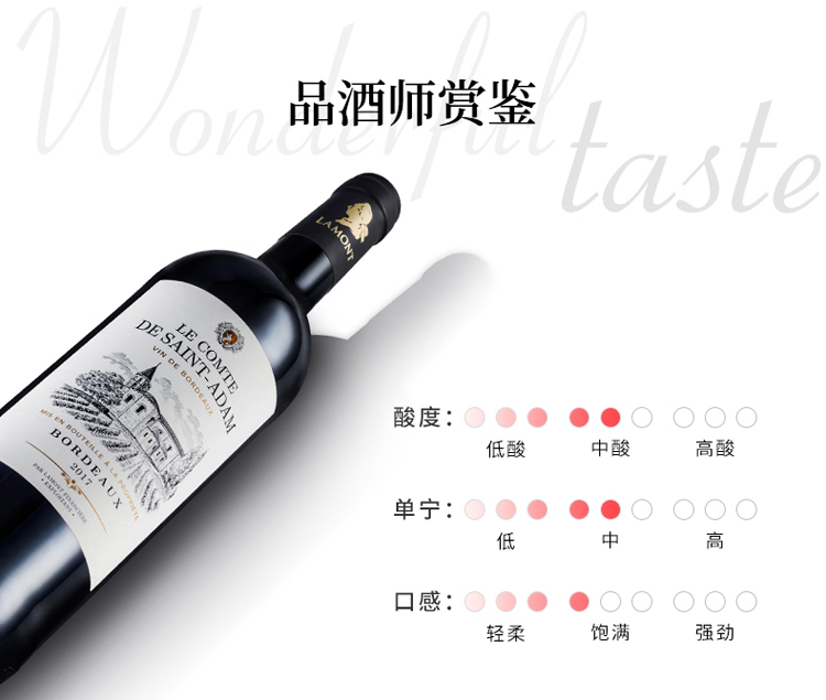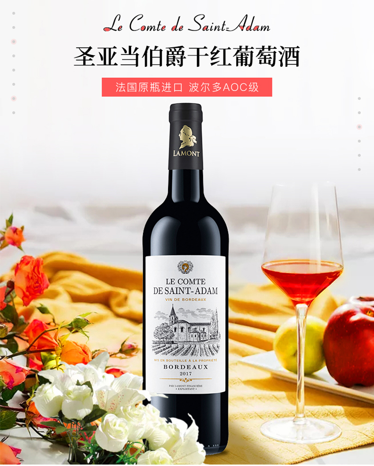颜色:宝石红;采摘年份:2017年;口感:柔和;特性:法定产区酒(AOC/AOP等);国产/进口:进口;适用场景:家庭聚会,礼节拜访,商务宴请,婚礼婚宴,情侣约会,自斟自饮,闺蜜私语,派对活动;包装:整箱装;类别:红葡萄酒;葡萄品种:赤霞珠(Cabernet Sauvignon),梅洛(Merlot);类型:静止酒;香型:果香;产地:法国;容量:750mL;甜度:干型;保质期:无;酒精度:13.0%;原产地:法国;存储方法:避免阳光直射,于干燥阴凉处;产品重量:11kg;容量:750ml;包装清单:拉蒙 法国原瓶进口红酒 波尔多AOC 圣亚当伯爵干红葡萄酒 整箱装 750ml*6瓶;