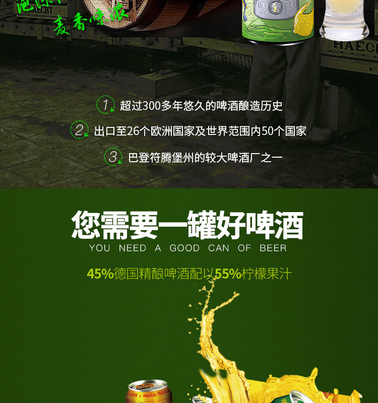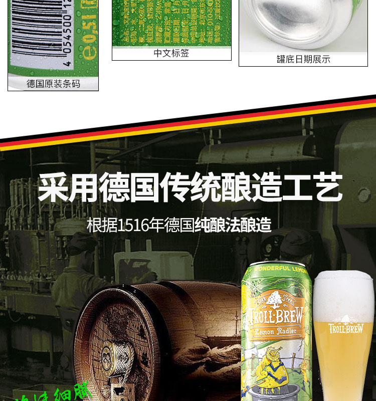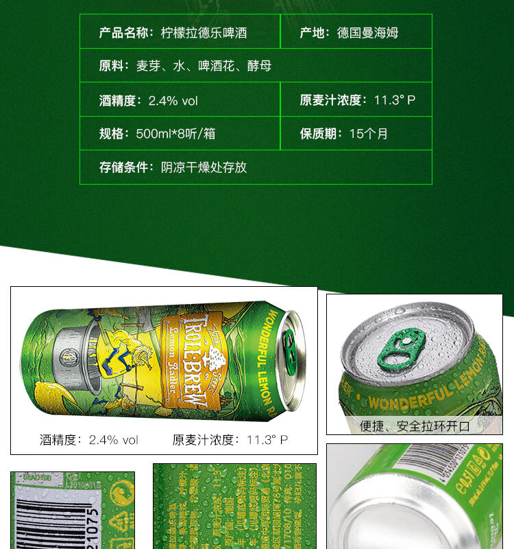 国产/进口:进口;产地:德国;适用场景:礼节拜访,家庭聚会,自斟自饮,情侣约会,烧烤撸串,派对必备,酒吧夜店;包装:听装;容量:500mL;类别:精酿;原料:水、大麦芽、果葡糖浆、柠檬汁、橙汁、白砂糖、二氧化碳、柠檬提取物、柠檬酸、酒花浸膏、刺槐豆胶、食用香料。;系列:精酿;保质期:15个月;酒精度:2.4%voL;原产地:德国;原麦汁浓度:11.3°P;存储方法:常温;产品重量:4.2kg;容量:500mL;包装清单:艾斯宝柠檬拉德乐啤酒500ml*8听;