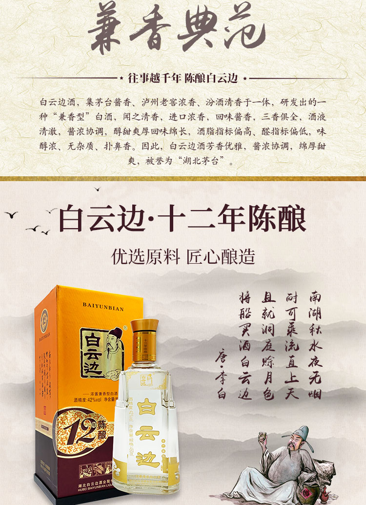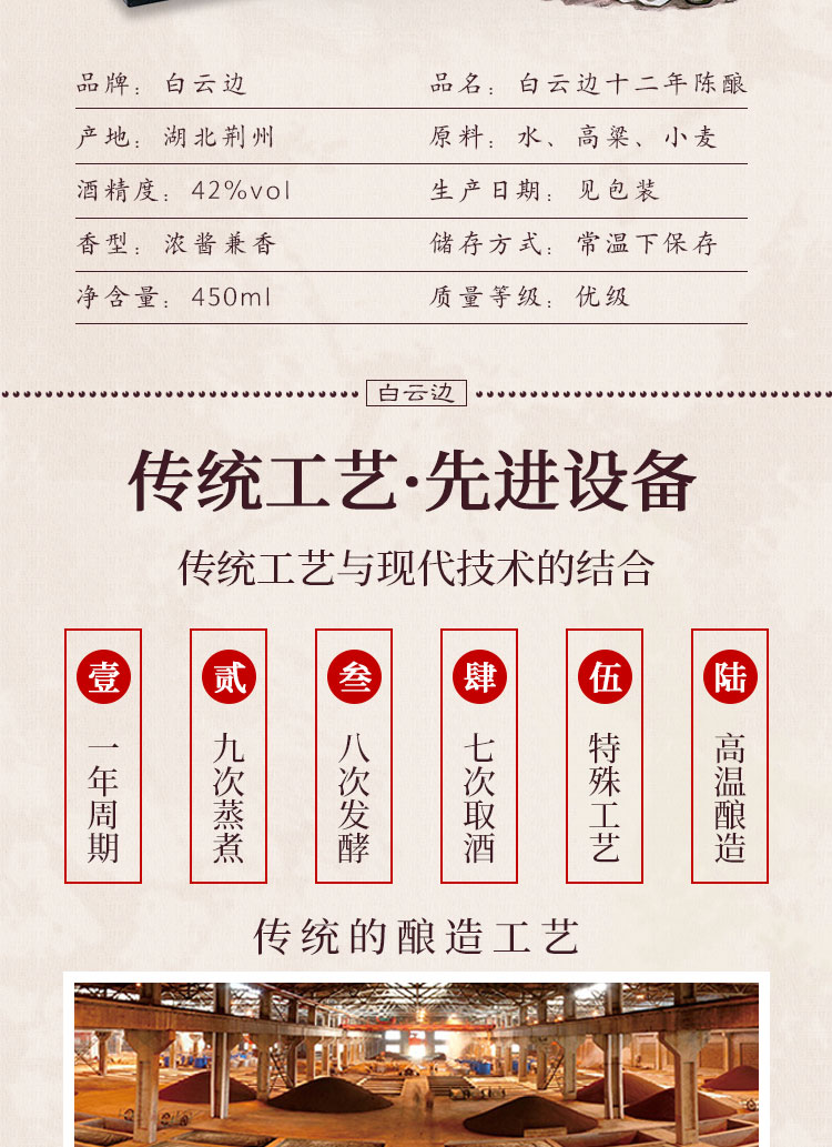 包装:整箱装;容量:376-499mL;香型:兼香型;产地:湖北;度数:40-49度;酒精度:42%vol;容量:450ml;产品重量:8300g;包装清单:白云边 白酒 十二年陈酿 浓酱兼香型 42度 450ml*6瓶 整箱装;