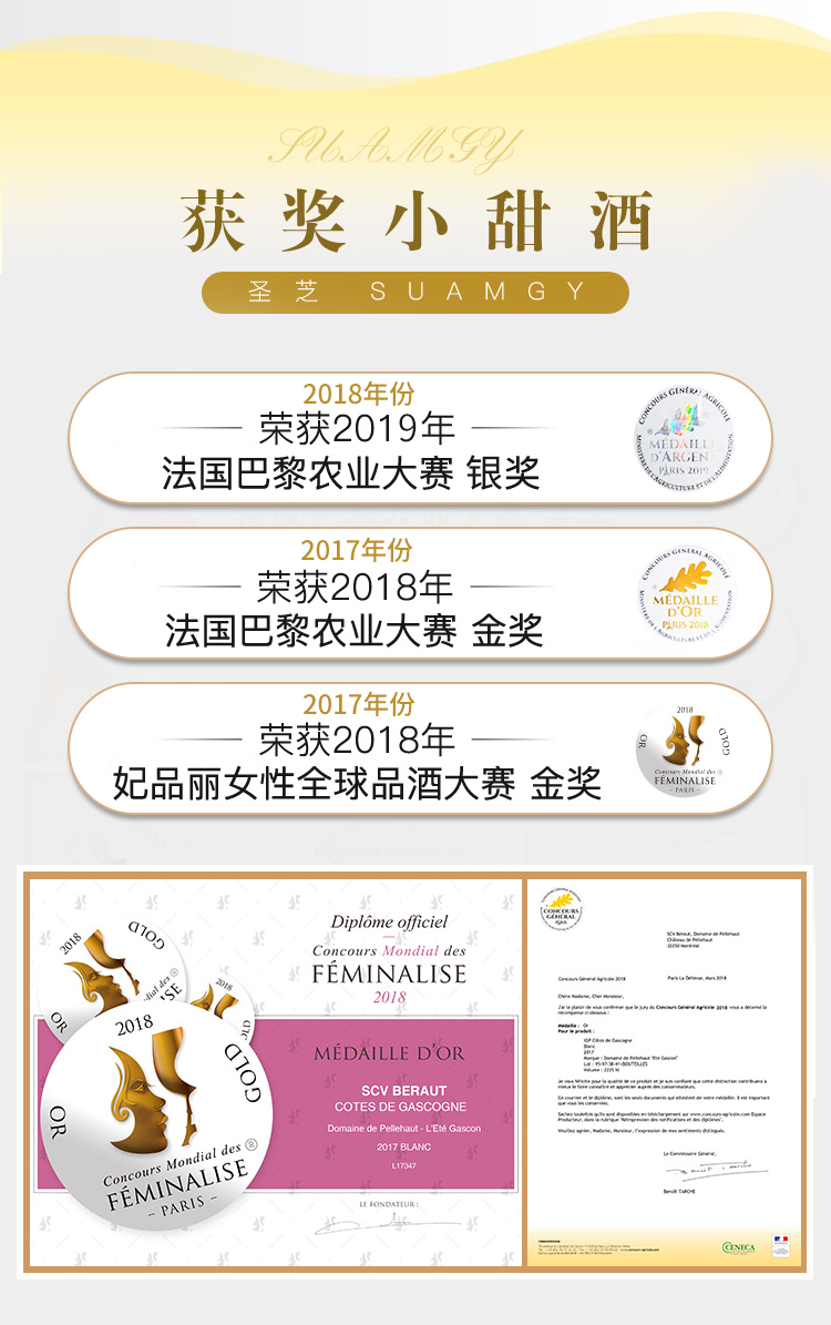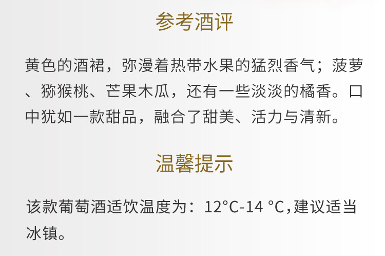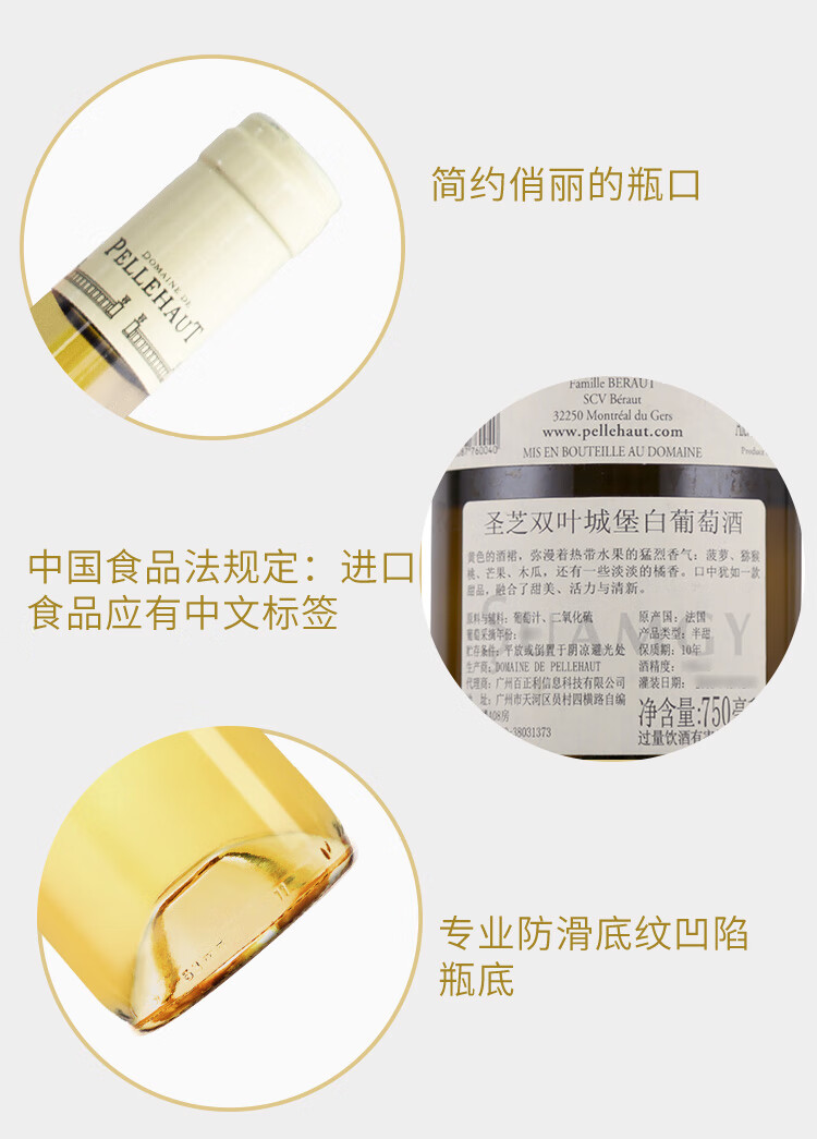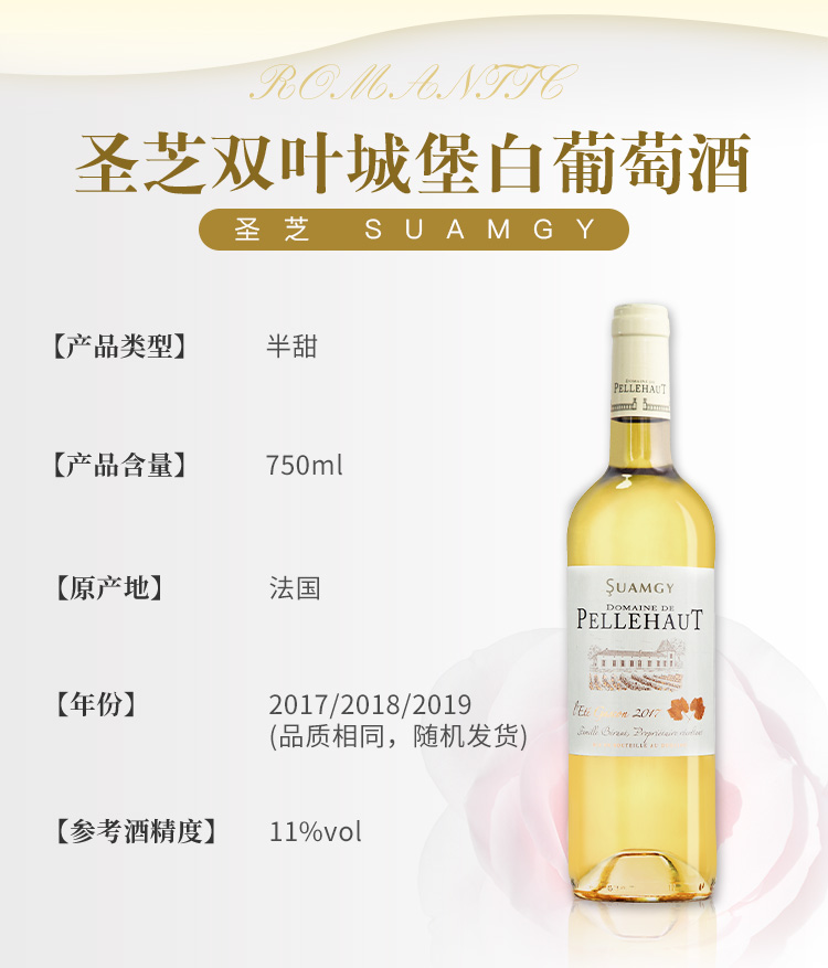 颜色:金色;口感:香甜;特性:其它;国产/进口:进口;适用场景:礼节拜访,商务宴请,情侣约会,闺蜜私语,派对活动;包装:瓶装;酸度:高酸;类别:白葡萄酒;葡萄品种:其它,霞多丽(Chardonnay);类型:静止酒;香型:香料,花香,果香;产地:法国;容量:750mL;甜度:半甜型;保质期:10年;酒精度:11%vol;原产地:法国;存储方法:平放或倒置于阴凉避光处;容量:750mL;产品重量:1.18kg;包装清单:圣芝双叶城堡白葡萄酒*1;