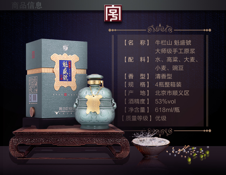 包装:整箱装;容量:500-749mL;香型:清香型;产地:北京;度数:50度及以上;酒精度:53%vol;容量:618ml;产品重量:8800g;包装清单:牛栏山 魁盛號 大师级手工原浆 53度 618ml*4瓶 整箱装 二锅头 清香型白酒(内含四个礼品袋)*1;