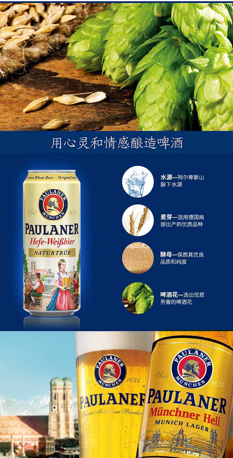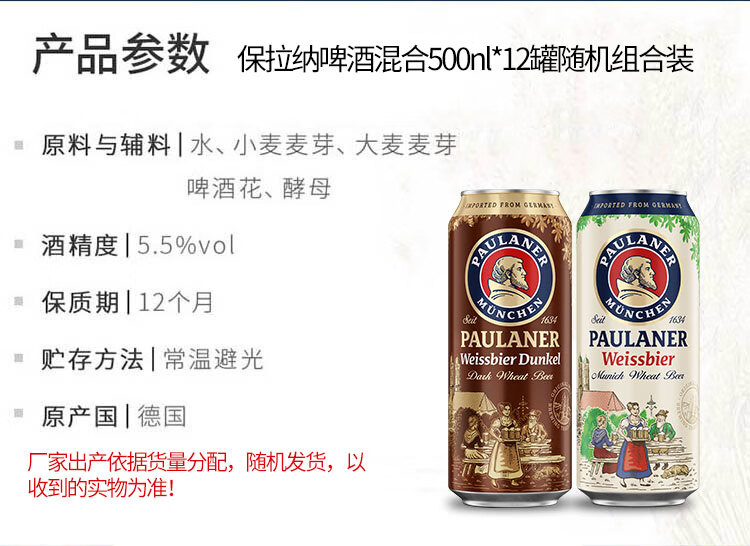 国产/进口:进口;产地:德国;适用场景:礼节拜访,家庭聚会,自斟自饮,烧烤撸串,派对必备;包装:礼盒装;容量:500mL;类别:黄啤酒;原料:水、大麦芽、啤酒花、酵母;系列:酵母型啤酒;保质期:365天;酒精度:5.5;原产地:德国;原麦汁浓度:12.5°P;存储方法:常温避光保存;产品重量:6.56kg;容量:500ml;包装清单:德国原装进口 保拉纳(PAULANER) 啤酒混合装礼盒 500ml*12罐装*1;