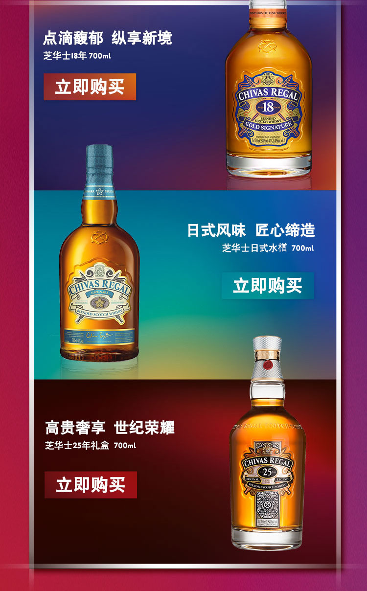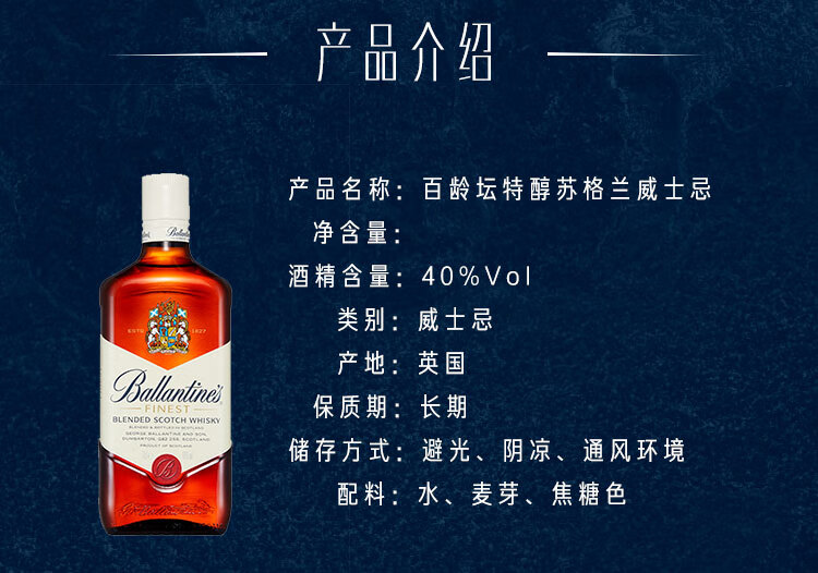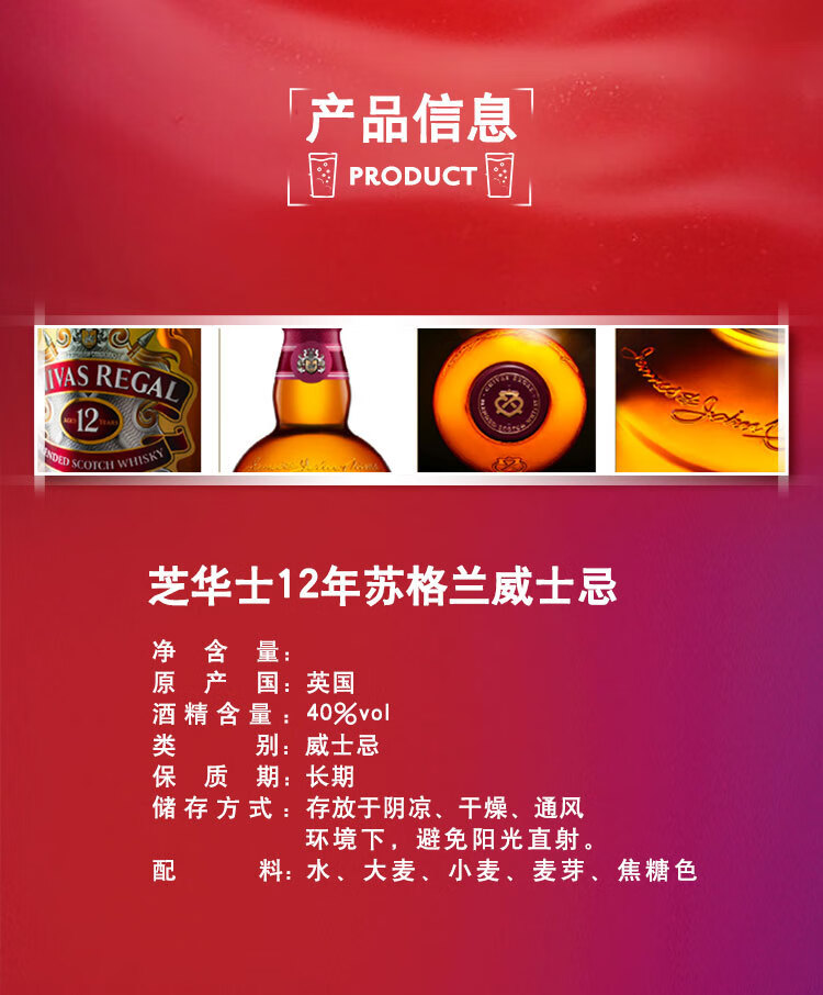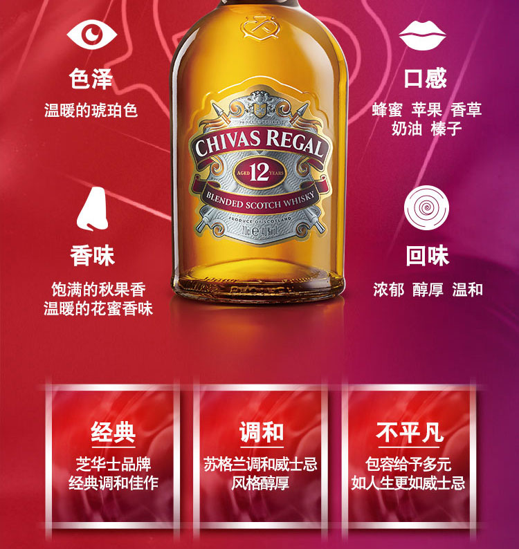 类型:调和威士忌;产地:苏格兰;适用场景:自斟自饮,亲友馈赠,家庭聚会,商务宴请,情侣约会,闺蜜私语;包装:瓶装;容量:1L及以上;阶段:小白入门;原料:水、大麦、小麦、麦芽;保质期:长期;酒精度:40%vol;存储方法:常温避光;产品重量:3.65kg;容量:3000mL;包装清单:芝华士12年1000ml+百龄坛特醇1000ml 洋酒 苏格兰 威士忌 套装*1;