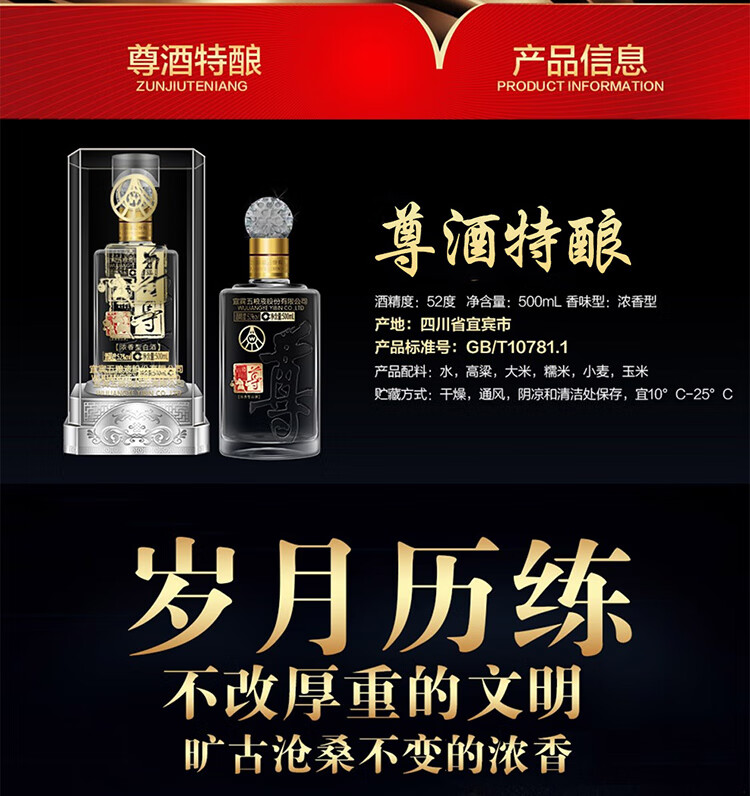 包装:整箱装;容量:500-749mL;香型:浓香型;产地:四川;度数:50度及以上;酒精度:52%vol;容量:500;产品重量:9635g;包装清单:尊酒特酿52度500ml*6瓶整箱装;