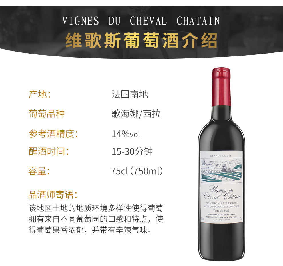 颜色:宝石红;采摘年份:2019年;口感:强劲;特性:普通餐酒;国产/进口:进口;适用场景:礼节拜访,商务宴请,婚礼婚宴,家庭聚会,自斟自饮,派对活动;包装:整箱装;酸度:中酸;类别:红葡萄酒;葡萄品种:歌海娜(Grenache),西拉/设拉子(Syrah/Shiraz);类型:静止酒;香型:果香;产地:法国;容量:750mL;甜度:干型;系列:美斯蒂维歌斯;保质期:10年;酒精度:14%vol;原产地:法国;存储方法:阴凉干燥,避光、斜放;容量:750ML;产品重量:7.08kg;包装清单:法国原装简箱;
