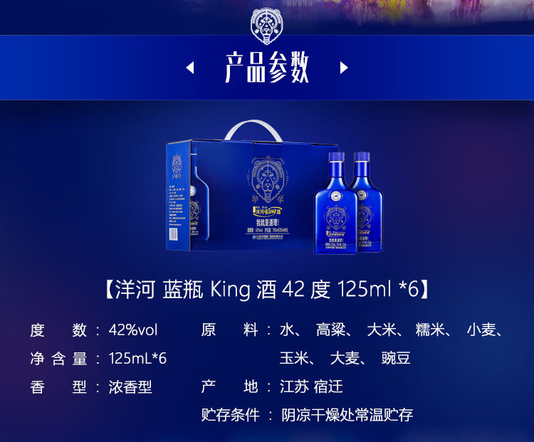 包装:礼盒装;容量:500-749mL;香型:浓香型;度数:40-49度;香型:浓香型;产地:江苏;酒精度:42%vol;包装:礼盒装;产品重量:0g;容量:125ml;包装清单:King酒 42度 盒装白酒125ml*6*1;