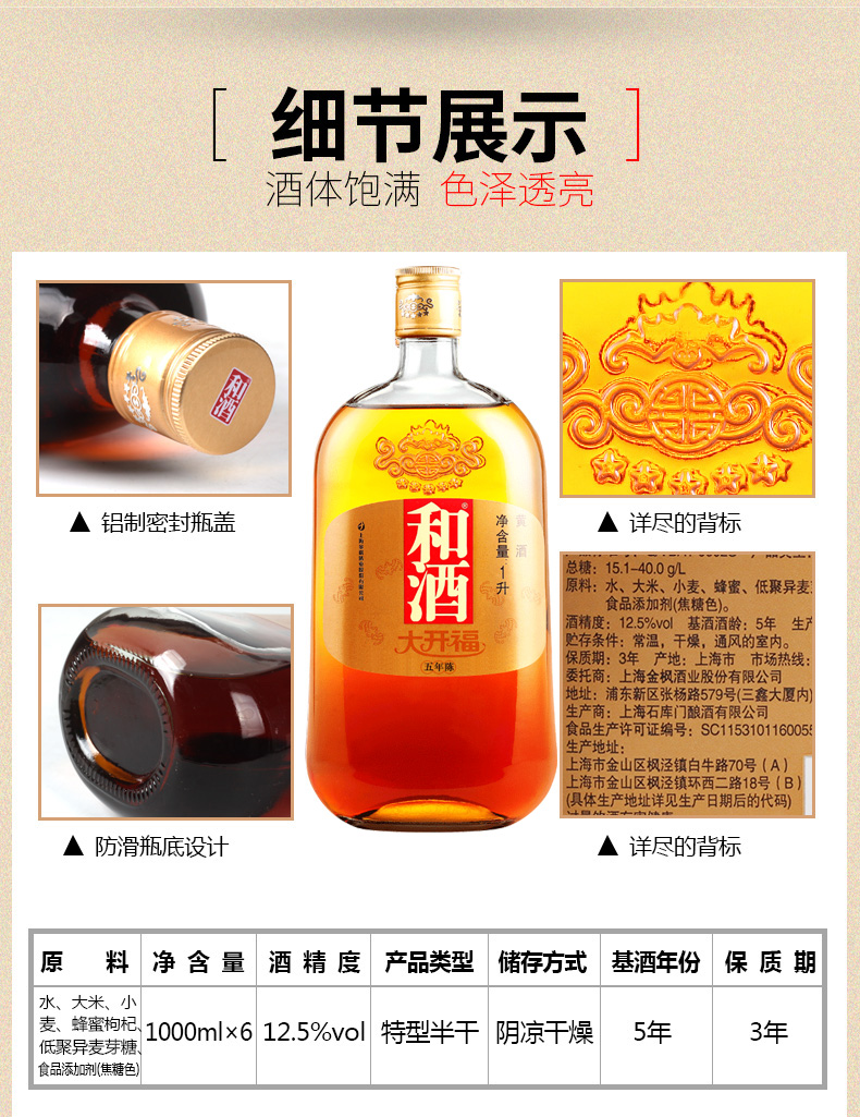 口味:半干型黄酒(总糖:15.0-40.0g/L);度数:10-19度;产地:上海;适用场景:商务宴请,礼节拜访,家庭聚会,朋友小聚,婚宴用酒,自斟自饮;包装:整箱装;容量:5L以上;保质期:1095天;酒精度:12.5度;存储方法:干燥通风处;容量:1000mL;产品重量:1kg;包装清单:1L*6瓶;