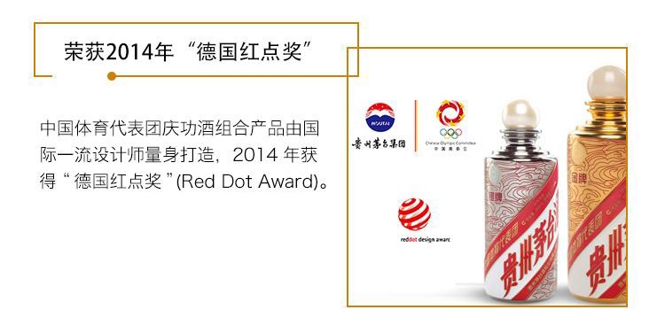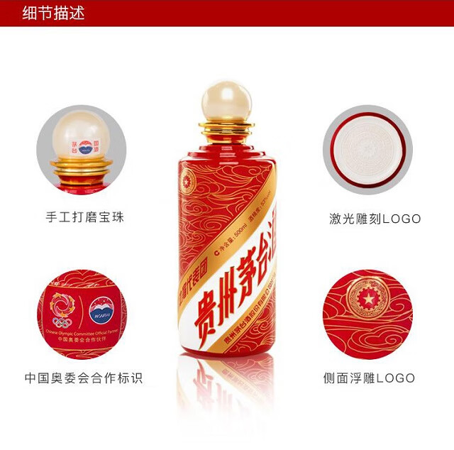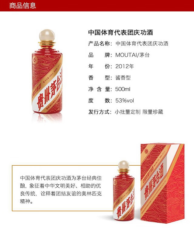 包装:瓶装;容量:376-499mL;香型:酱香型;度数:50度及以上;香型:酱香型;产地:仁怀;酒精度:53%vol;包装:瓶装;产品重量:1100g;容量:500ml;包装清单:2012中国体育代表团庆功酒*1;