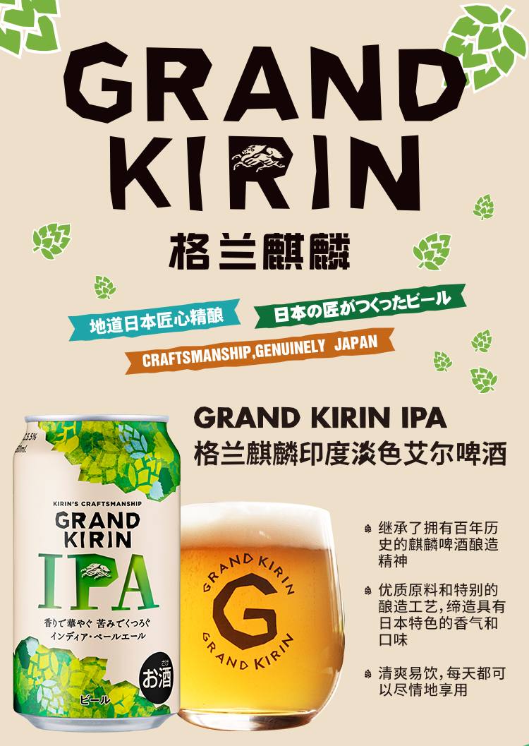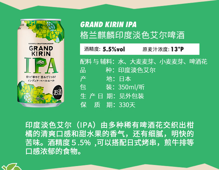 国产/进口:进口;产地:日本;适用场景:野餐出游,礼节拜访,家庭聚会,自斟自饮,情侣约会,烧烤撸串,派对必备,酒吧夜店;包装:听装;容量:331-499mL;类别:精酿;原料:水、大麦麦芽、啤酒花;保质期:360天;酒精度:5.5%vol;原产地:日本;原麦汁浓度:13.0°P;存储方法:阴凉干燥处保存;产品重量:0kg;容量:350ml;包装清单:格兰麒麟350ml啤酒6瓶;