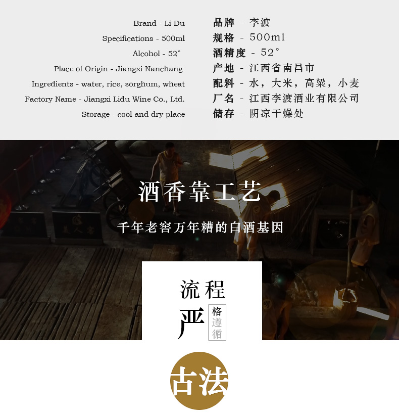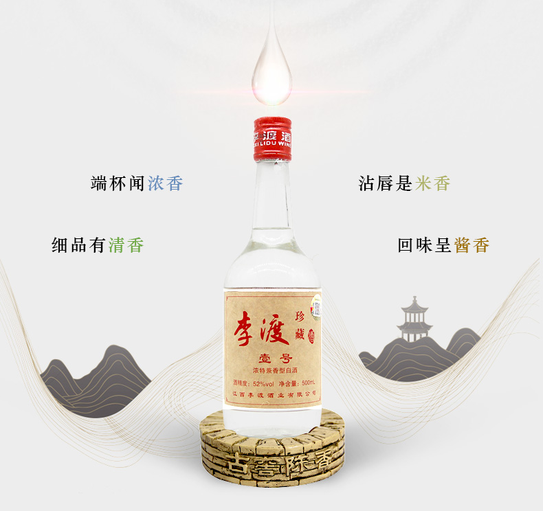 包装:瓶装;容量:376-499mL;香型:兼香型;产地:江西;度数:50度及以上;酒精度:52%vol;容量:500;产品重量:500g;包装清单:52度李渡酒珍藏壹号*1瓶;