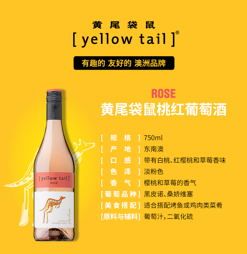 口感:清新;香型:花香,果香;特性:普通餐酒;国产/进口:进口;产地:澳大利亚;适用场景:婚礼婚宴,情侣约会,闺蜜私语,派对活动;包装:整箱装;容量:750mL;甜度:半干型;类别:桃红葡萄酒;葡萄品种:其它;系列:普通系列;保质期:长期;酒精度:13.5%vol;原产地:澳大利亚;存储方法:避光、常温贮藏;容量:750ml;产品重量:7.26kg;包装清单:黄尾袋鼠ROSE桃红葡萄酒 750ml*6瓶;