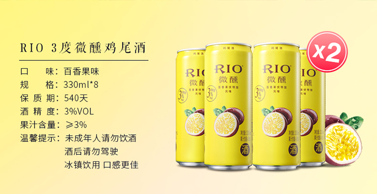 国产/进口:国产;产地:中国大陆;适用场景:家庭聚会,商务宴请,情侣约会,自斟自饮,亲友馈赠,闺蜜私语;包装:其它;容量:200-374mL;原料:水、白砂糖、果葡糖浆、食品添加剂、食用香精等;保质期:540天;酒精度:3%vol;存储方法:请置于阴凉干燥处,避免高温和阳光直晒,禁止加热或0℃以下冷冻,切勿撞击。;容量:330mL;产品重量:2.85kg;包装清单:锐澳微醺百香果味8罐 锐澳(RIO)洋酒 预调鸡尾酒 3度微醺 百香果口味 330*8罐;