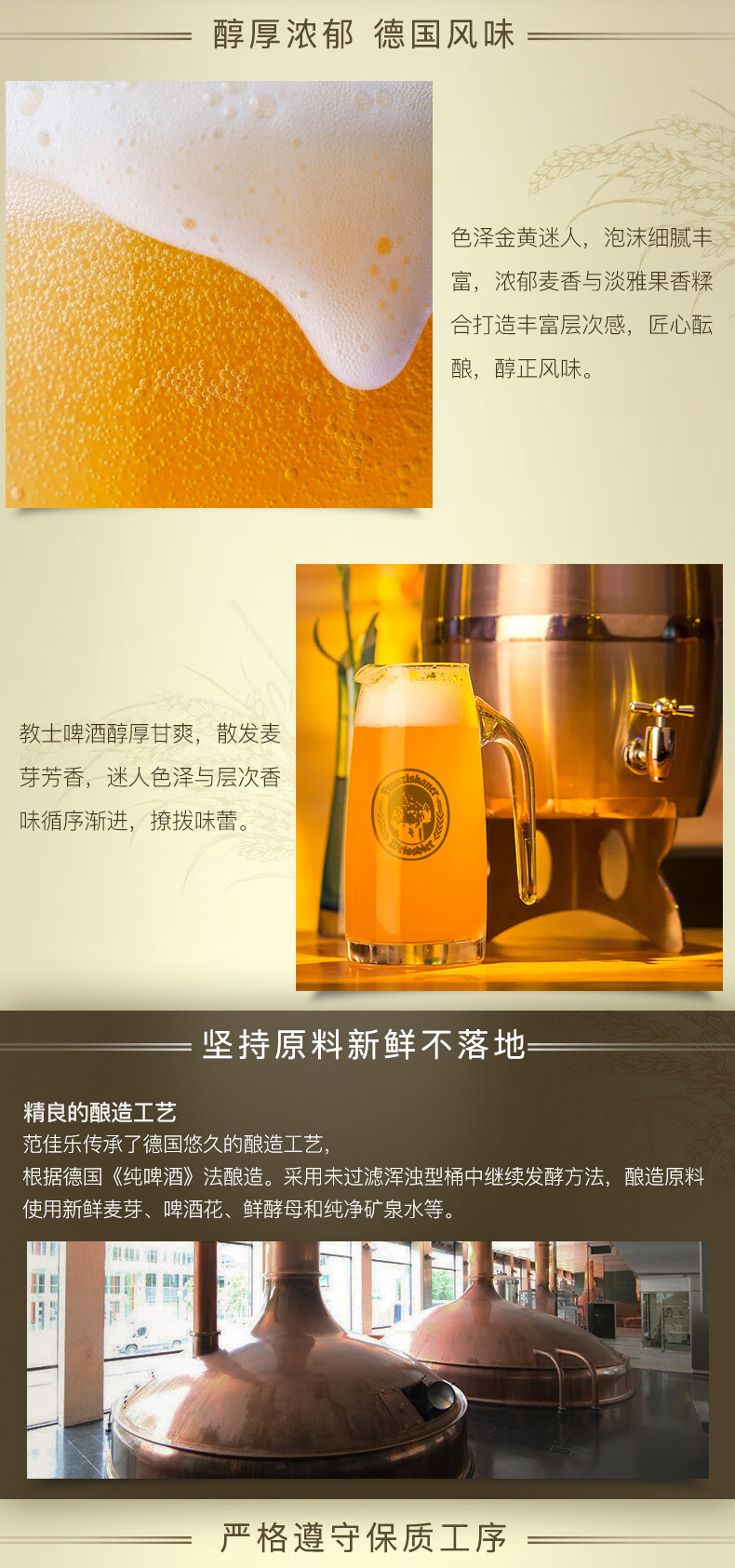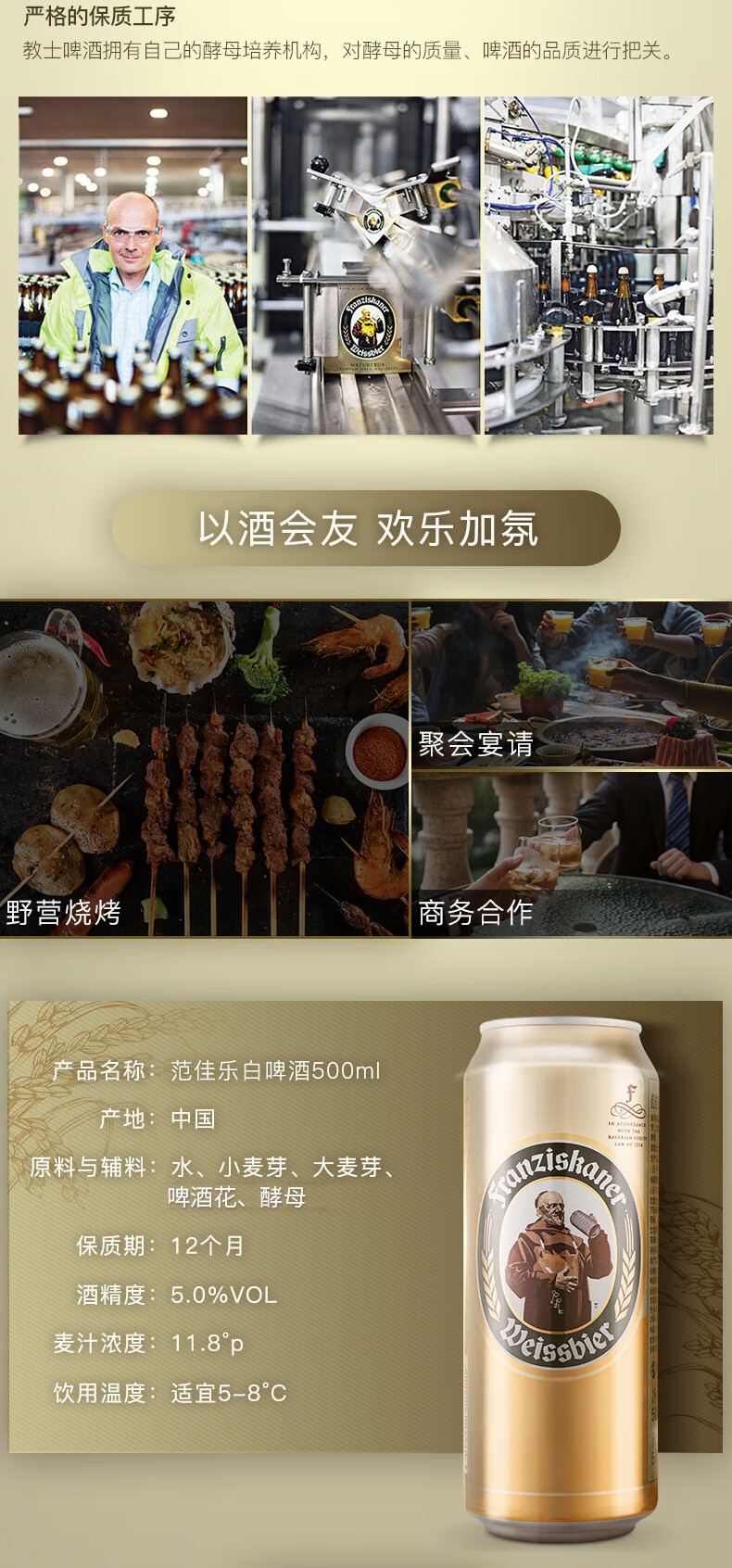 国产/进口:国产;产地:中国大陆;适用场景:野餐出游,礼节拜访,家庭聚会,自斟自饮,情侣约会,烧烤撸串,派对必备,酒吧夜店;包装:听装;容量:500mL;类别:白啤酒;原料:水、小麦芽、大麦芽、啤酒花、酵母;保质期:12个月;酒精度:5%VOL;原产地:中国大陆;原麦汁浓度:11.8°P;存储方法:宜在5°C~25°C运输和贮存,严防日晒、雨淋;容量:500ml;产品重量:6.46kg;包装清单:范佳乐(原教士)小麦啤酒 500ml*12听 整箱装;