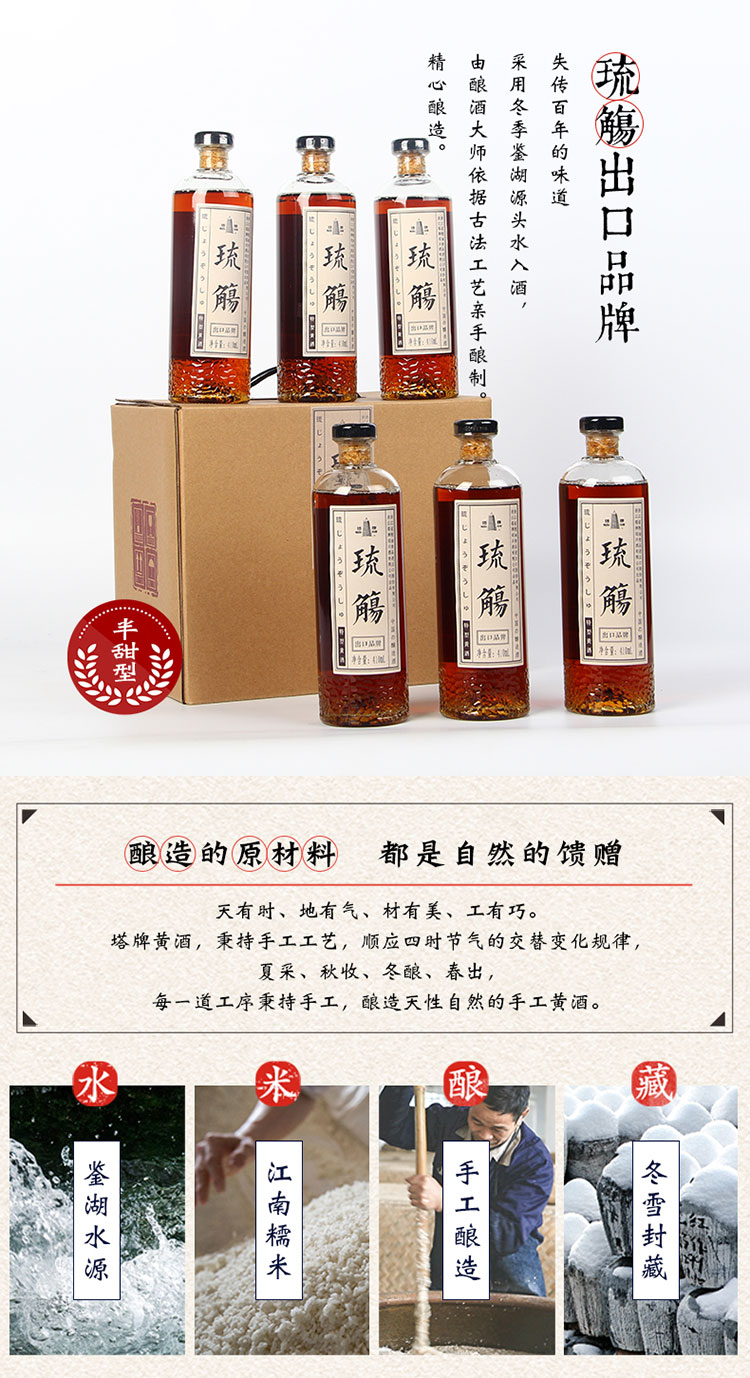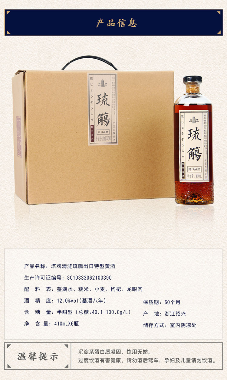 口味:半甜型黄酒(总糖:40.0-100.0g/L);度数:10-19度;产地:其它;适用场景:商务宴请,礼节拜访,家庭聚会,朋友小聚,自斟自饮;包装:整箱装;容量:500mL以下;保质期:5年;酒精度:12;存储方法:阴凉干燥;容量:410mL;产品重量:0.41kg;包装清单:410ml*6;