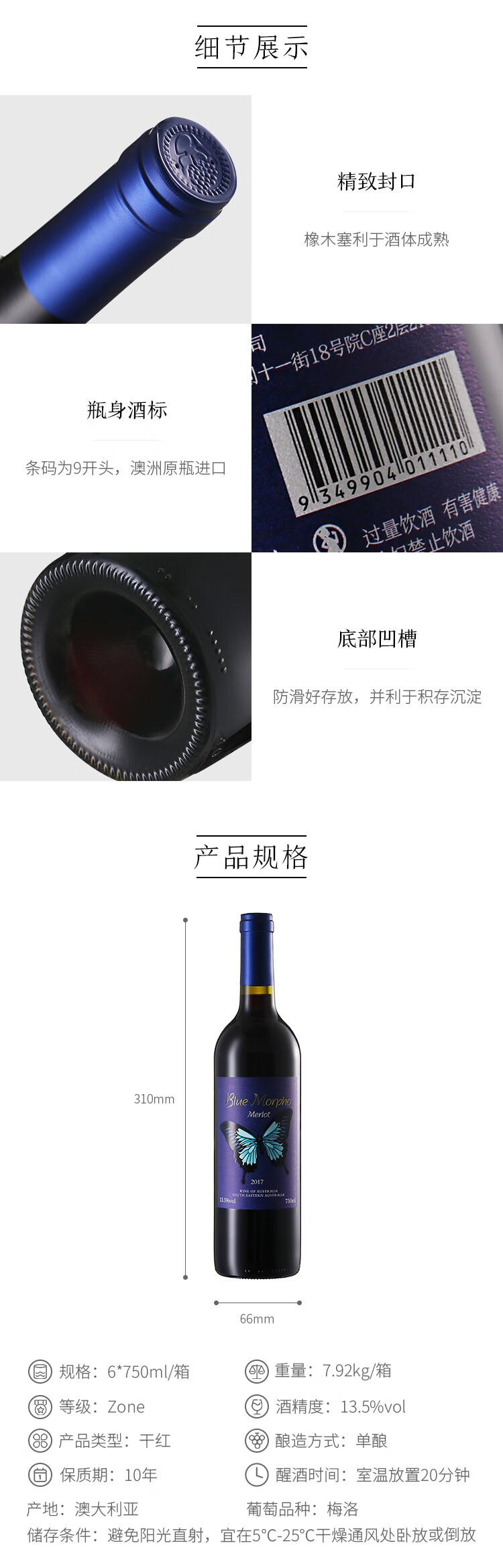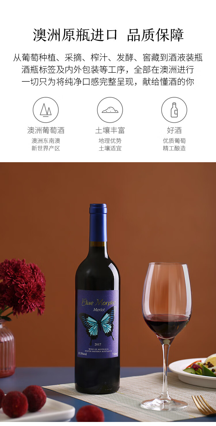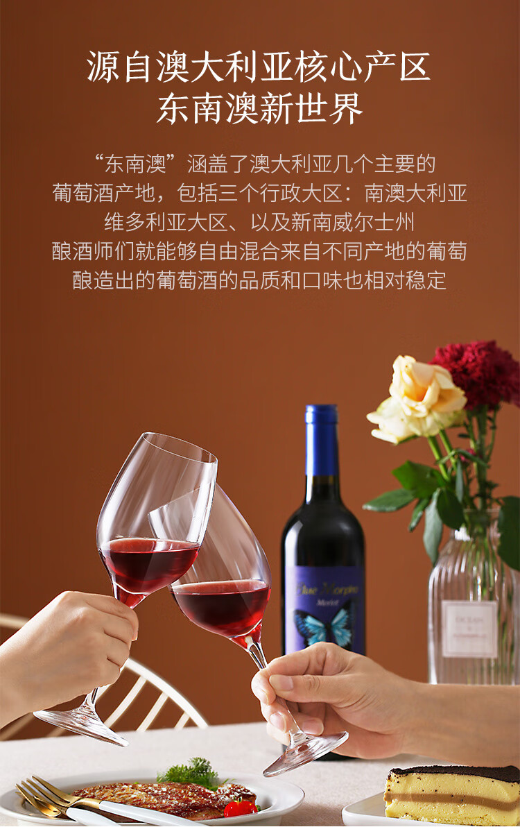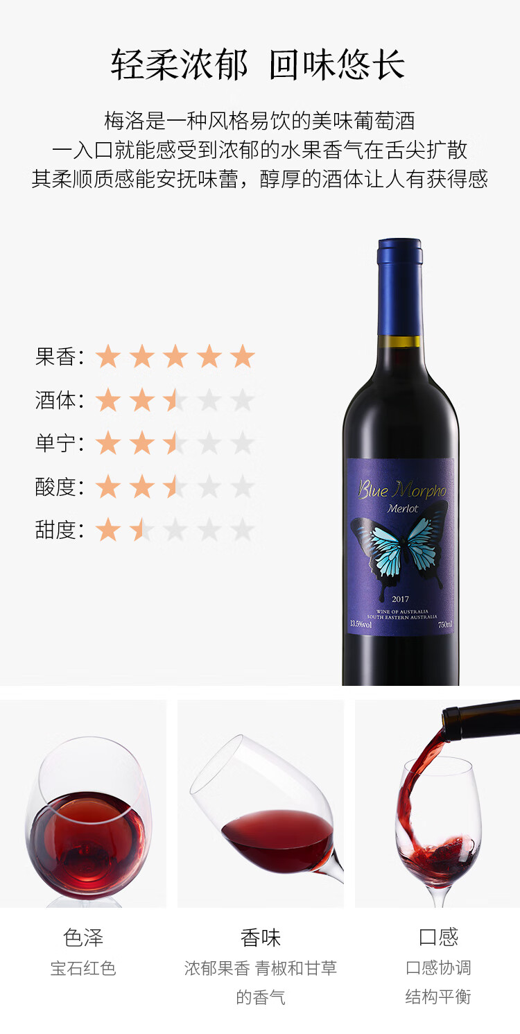 口感:柔和;特性:普通餐酒;国产/进口:进口;适用场景:礼节拜访,商务宴请,婚礼婚宴,情侣约会,家庭聚会,收藏,自斟自饮,闺蜜私语,派对活动;包装:整箱装;类别:红葡萄酒;葡萄品种:梅洛(Merlot);产地:澳大利亚;容量:750mL以上;甜度:干型;保质期:10年;酒精度:13%vol;原产地:澳大利亚;存储方法:常温避光卧放;容量:750ml;产品重量:7.9kg;包装清单:750ml*6;