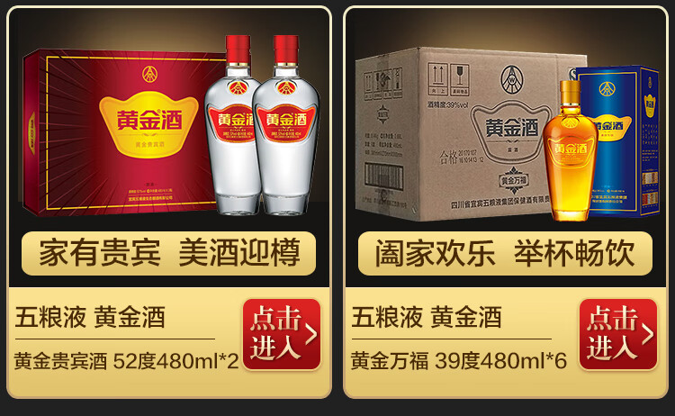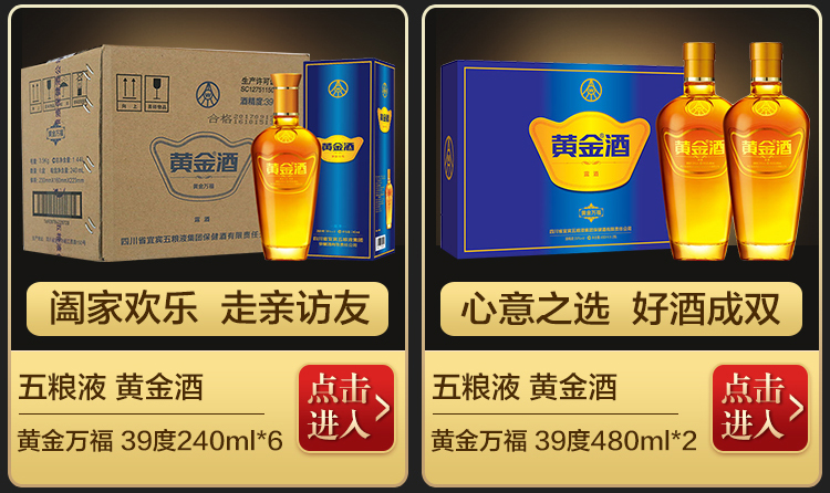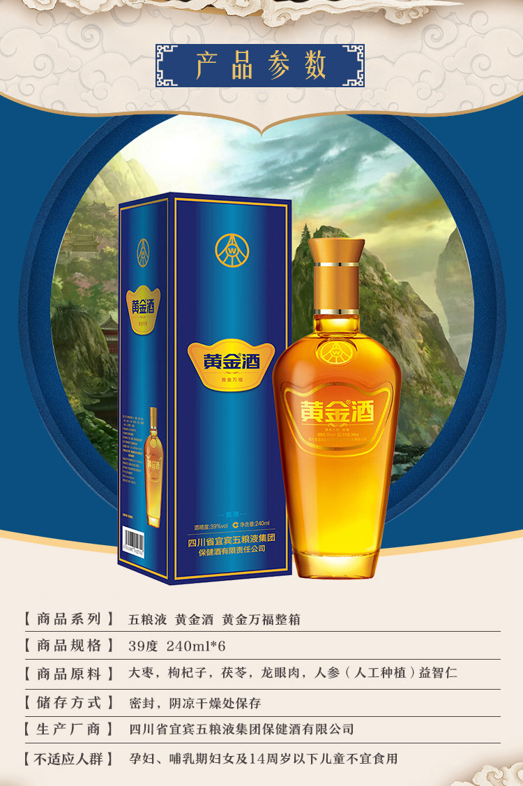 包装:整箱装;容量:375mL及以下;香型:其它;度数:35-39度;香型:其它;产地:四川;度数:39;包装:整箱装;产品重量(kg):3.35;容量:240ml;包装清单:五粮液 黄金酒 黄金万福 39度 白酒240ml*6整箱装*1;
