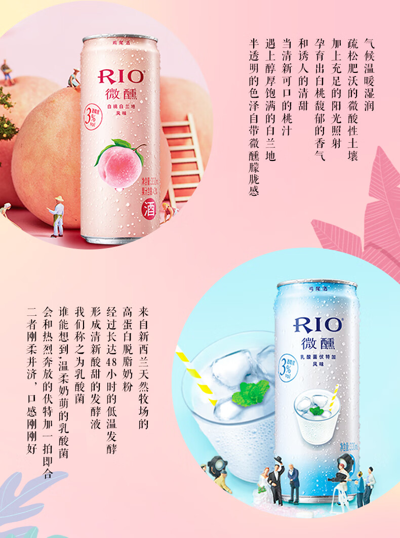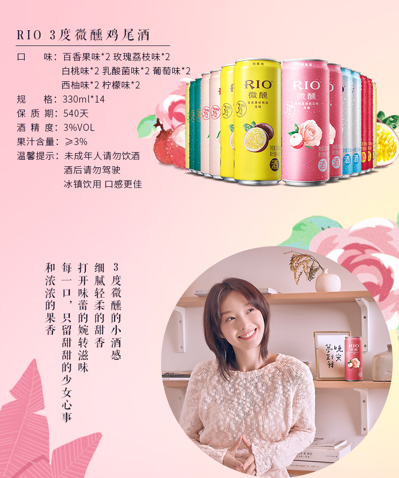 国产/进口:国产;产地:中国大陆;适用场景:家庭聚会,商务宴请,情侣约会,自斟自饮,亲友馈赠,闺蜜私语;包装:其它;容量:200-374mL;原料:水、果葡糖浆、白砂糖、食用香精等;保质期:540天;酒精度:3%vol;存储方法:阴凉干燥处;容量:330mL;产品重量:5.15kg;包装清单:锐澳(RIO)洋酒 预调 鸡尾酒 果酒 微醺系列 3度 330ml*14罐(9种口味)京东定制款(新老组合形式随机发货);