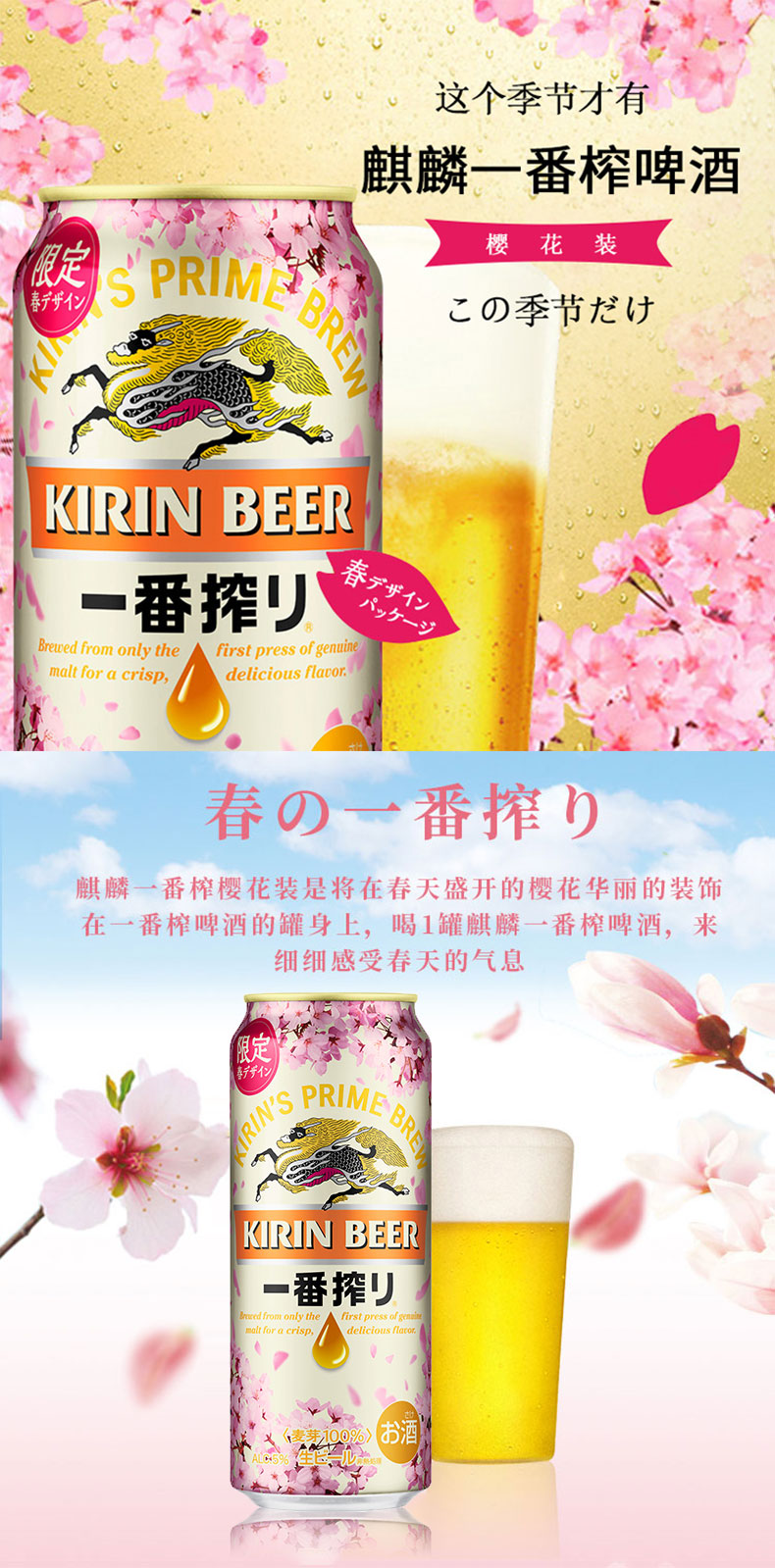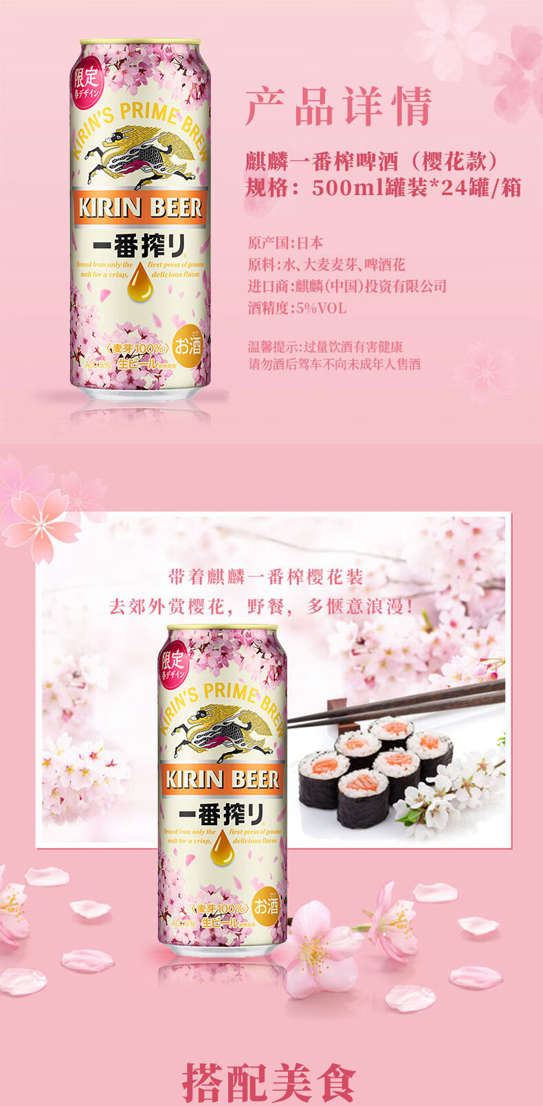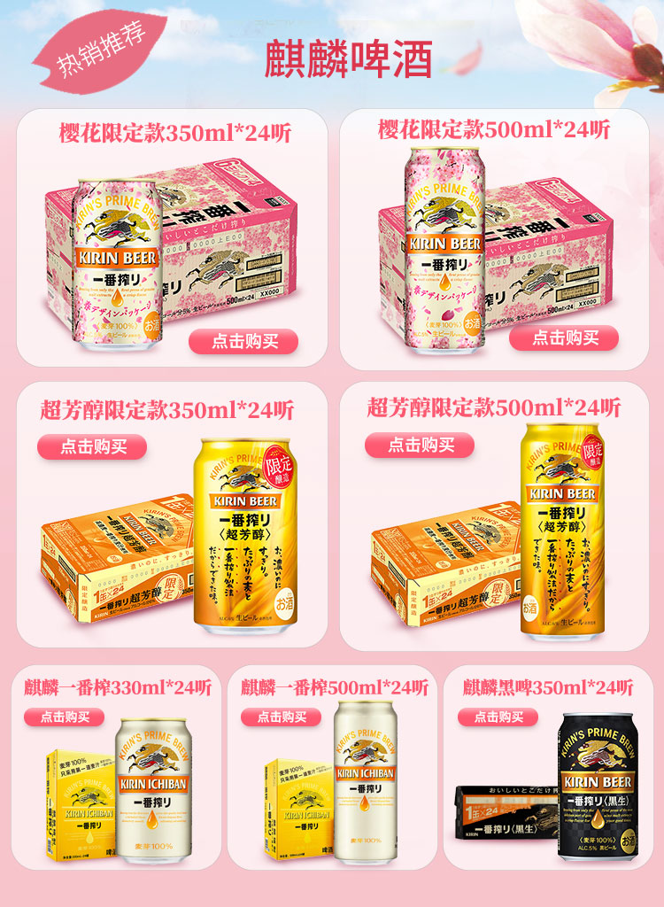 国产/进口:进口;产地:日本;适用场景:野餐出游,家庭聚会,自斟自饮,烧烤撸串,派对必备;包装:听装;容量:500mL;类别:黄啤酒;原料:水、麦芽、啤酒花;系列:麒麟;保质期:256天;酒精度:5%vol;原产地:日本;原麦汁浓度:11.1°P;存储方法:常温避光保存;产品重量:12.78kg;容量:500ml;包装清单:麒麟(Kirin)一番榨 樱花啤酒 500ml*24罐装 整箱装 日本进口*1;