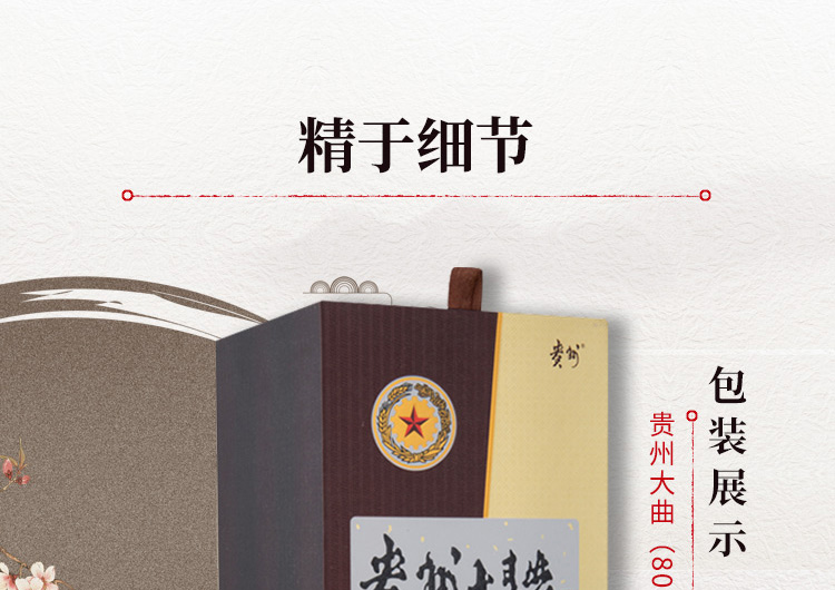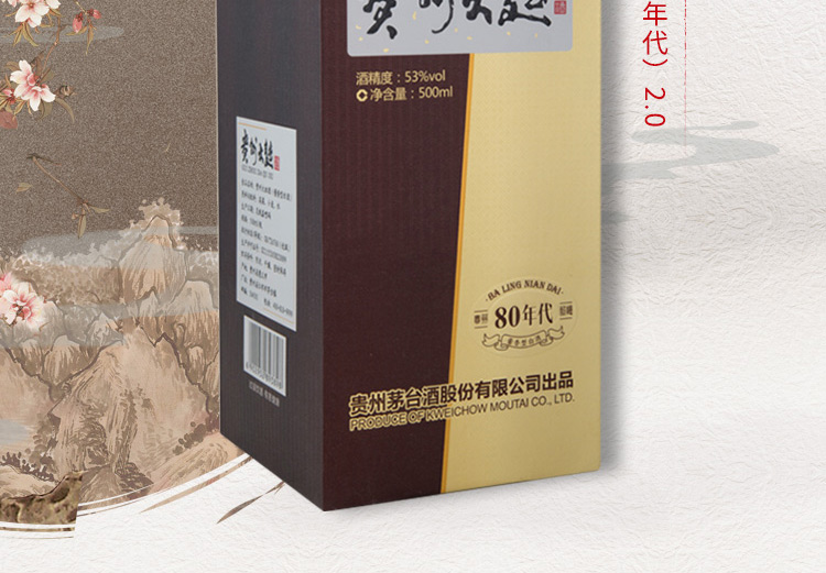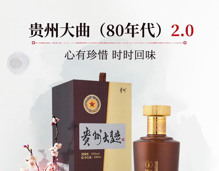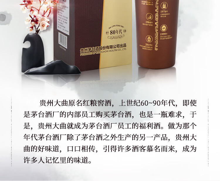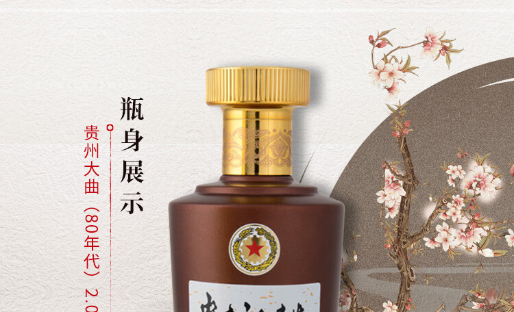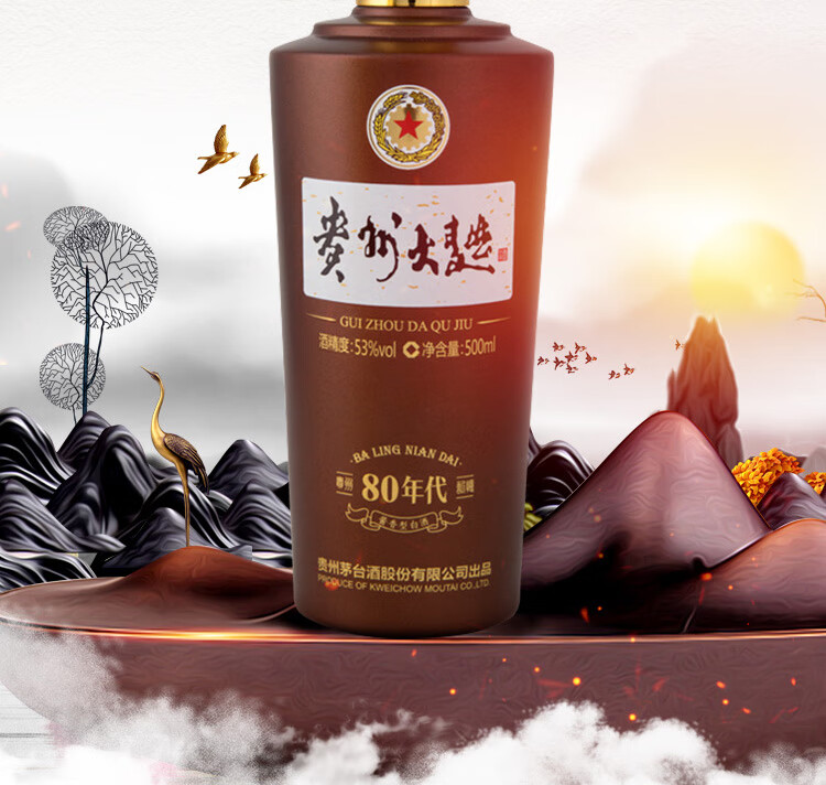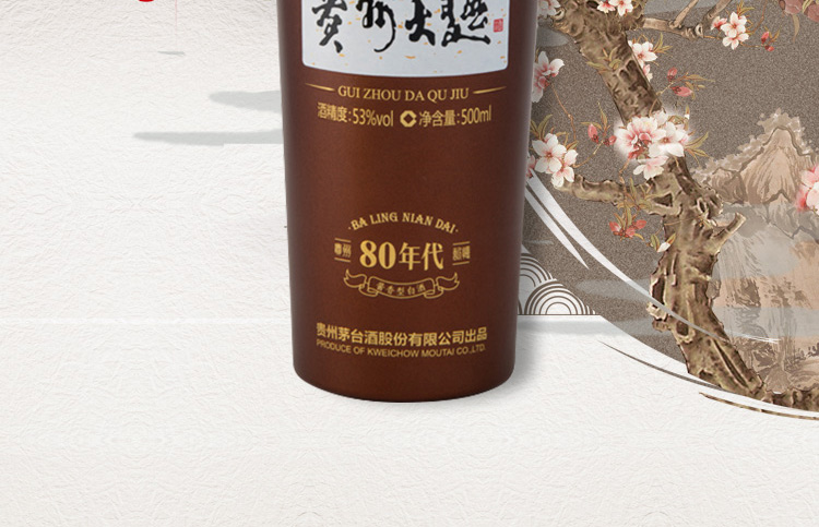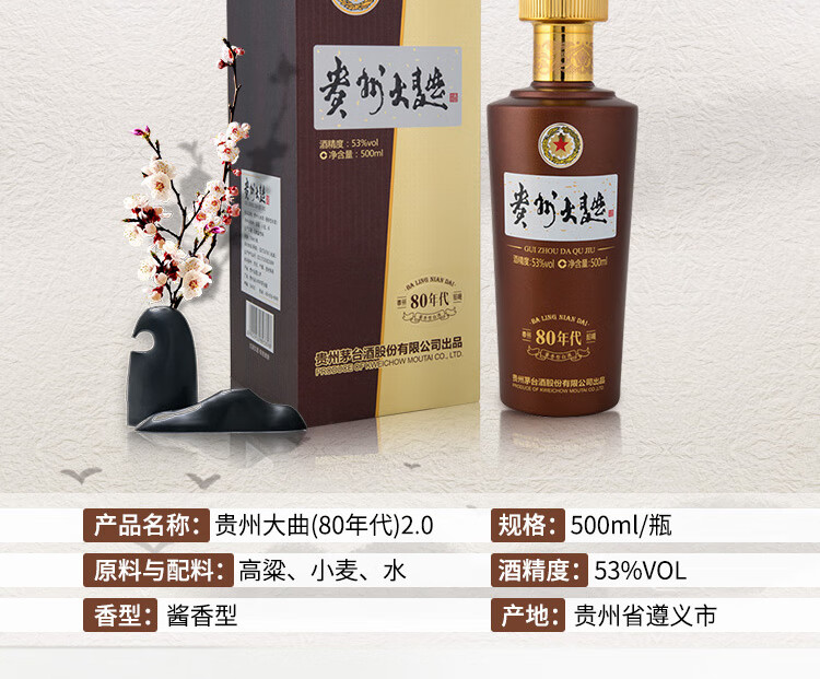 包装:瓶装;容量:500-749mL;香型:酱香型;度数:50度及以上;香型:酱香型;产地:中国大陆;酒精度:53%vol;包装:瓶装;产品重量:1340g;容量:500ml;包装清单:茅台 贵州大曲酒(80年代)(2.0)酱香型白酒 53度500ml单瓶装*1;