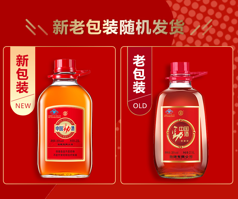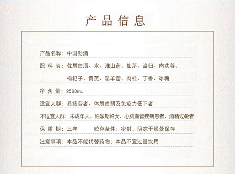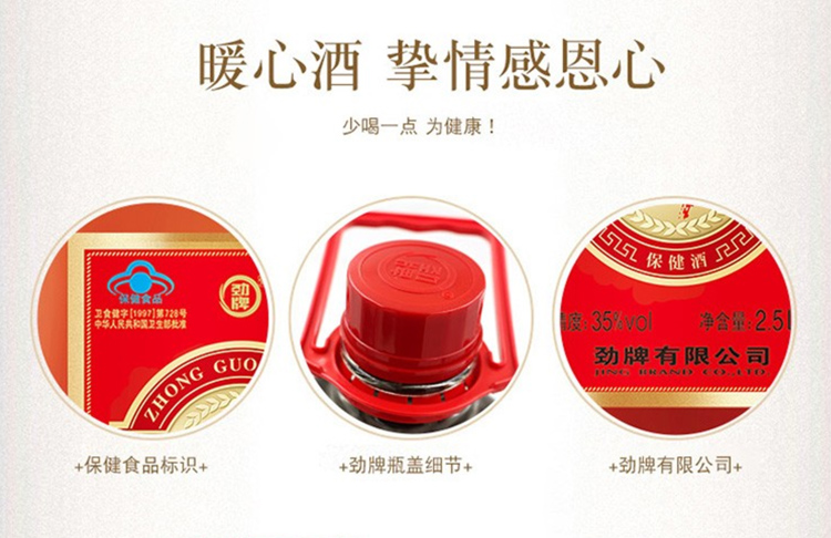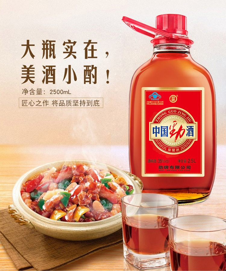 适用场景:家庭聚会,礼节拜访,商务宴请,自斟自饮;包装:瓶装;容量:1-5L;度数:35-39度;产地:湖北;保质期:3年;酒精度:35;存储方法:阴凉干燥处;容量:2500mL;产品重量:3.8kg;包装清单:劲牌 中国劲酒 35度 2.5L*1;