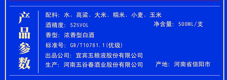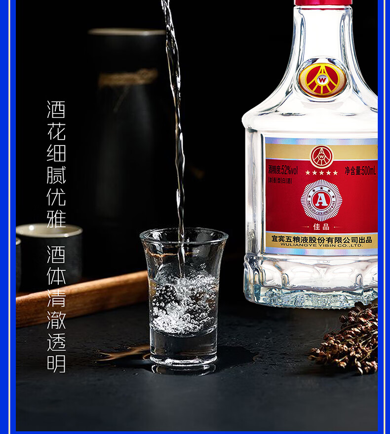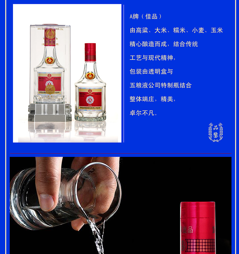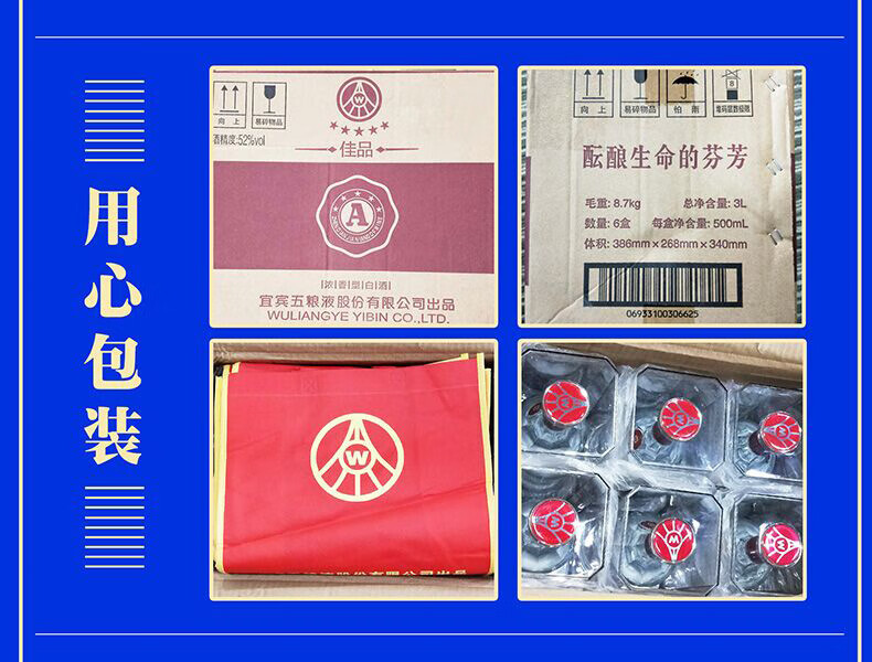 包装:整箱装;容量:500-749mL;香型:浓香型;度数:50度及以上;容量:500ml;产品重量(kg):9;包装:整箱装;存储方法:阴暗,干燥;酒精度:52度;香型:浓香型;等级:优级;省份:河南;包装清单:【整箱】五粮液股份公司 A级佳品 52度 浓香型白酒 500ml*6 (内含3支手提袋);