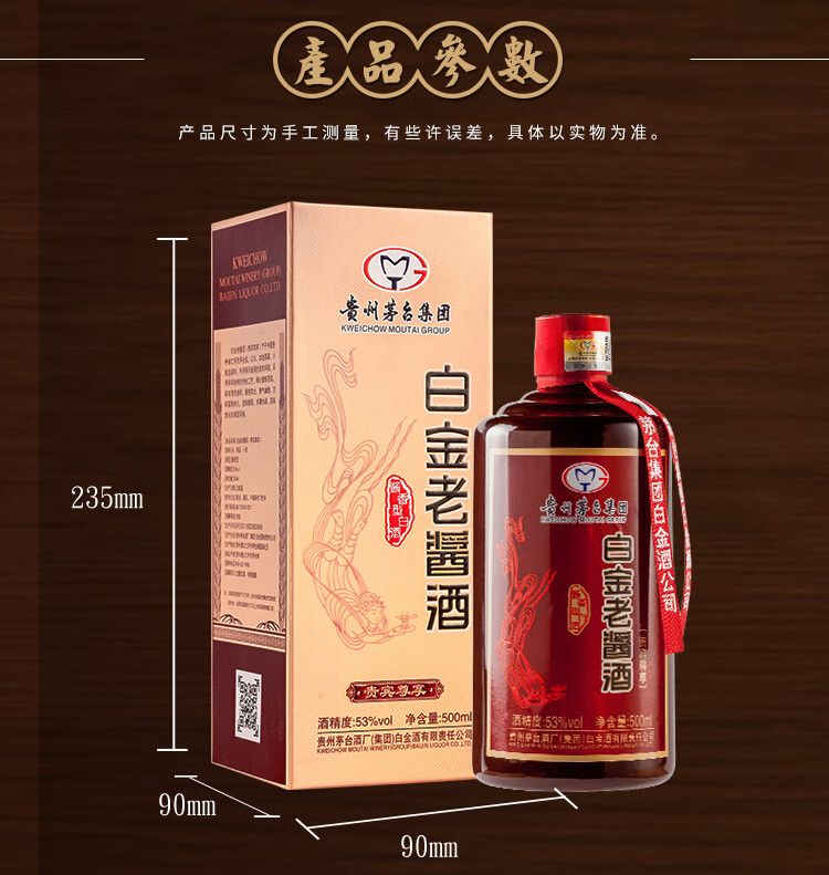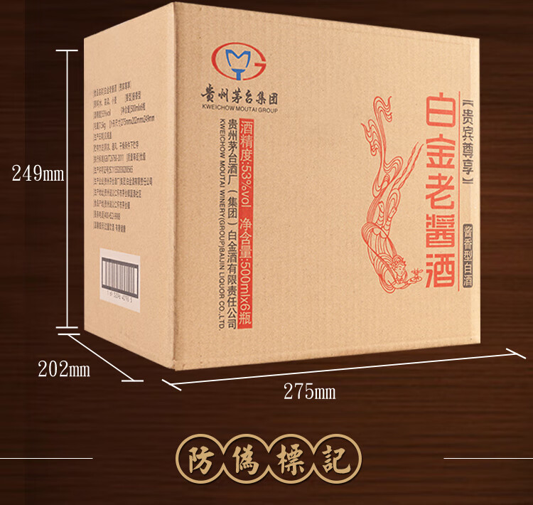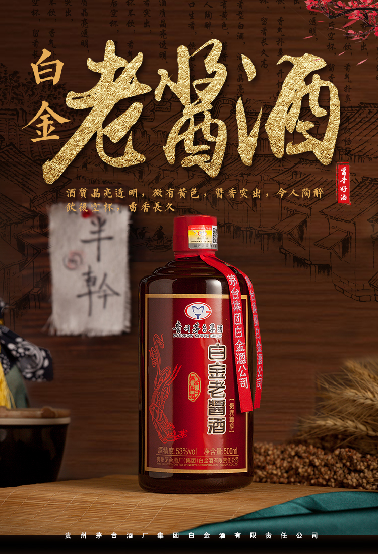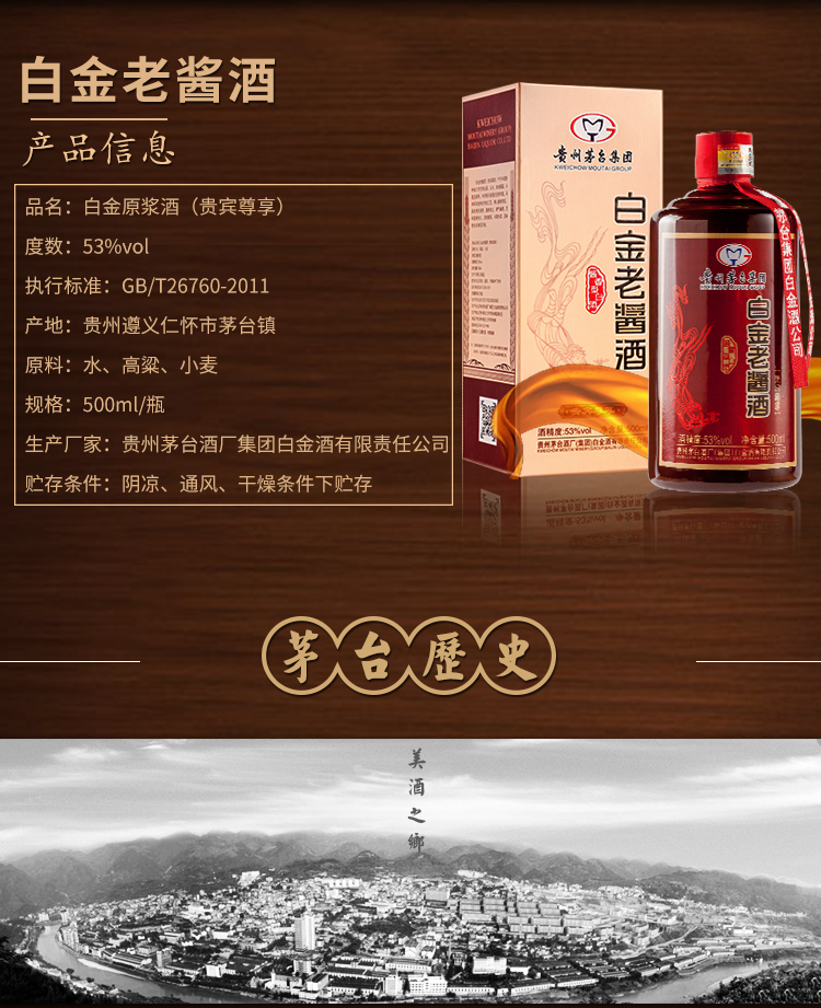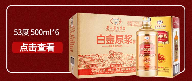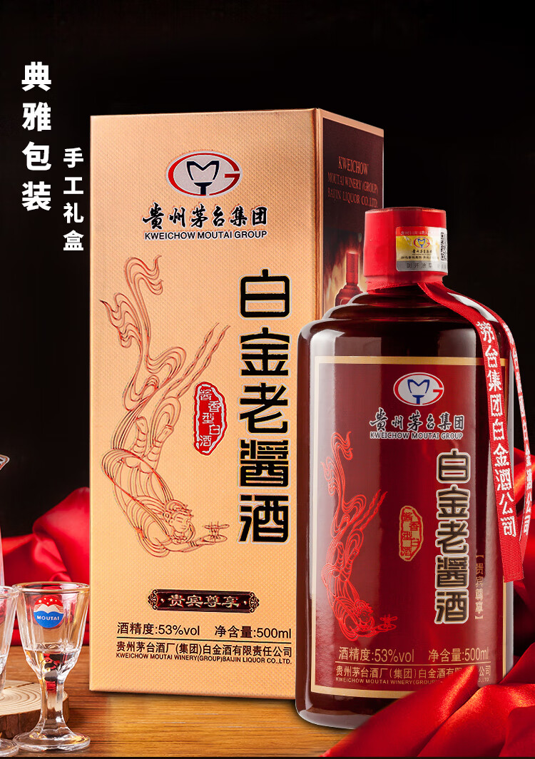 包装:整箱装;容量:376-499mL;香型:酱香型;产地:贵州;度数:50度及以上;酒精度:53%vol;容量:500ml*6;产品重量:7500g;包装清单:茅台集团白金酒公司 白金老酱酒 贵宾尊享 酱香型白酒53度500ml*6瓶、礼品袋*3;