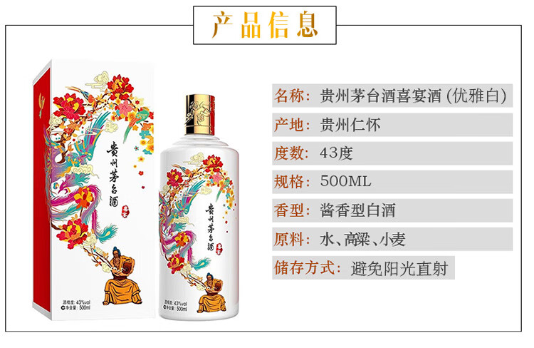 包装:瓶装;容量:500-749mL;香型:酱香型;产地:贵州;度数:40-49度;酒精度:43%vol;容量:500ml;产品重量:500g;包装清单:贵州茅台酒 喜宴(优雅白)43度 500ml 单瓶装 酱香型白酒 *1;