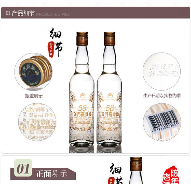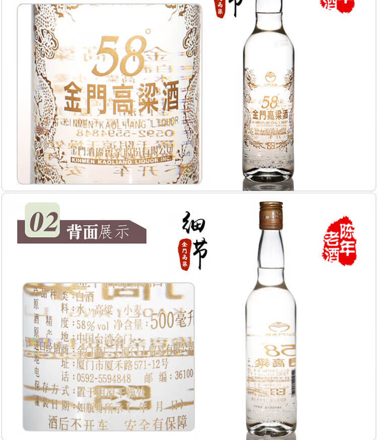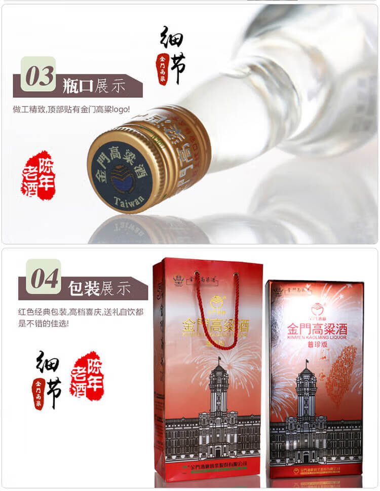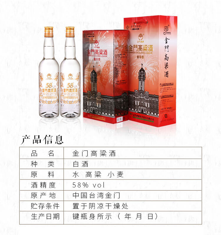 包装:礼盒装;容量:500-749mL;香型:其它;产地:中国台湾;度数:50度及以上;酒精度:58%vol;容量:500ml*2;产品重量:1945g;包装清单:2013年老酒台湾金门高粱酒 58度 清香型 珍藏白金龙普珍版 500ml*2瓶×1盒;