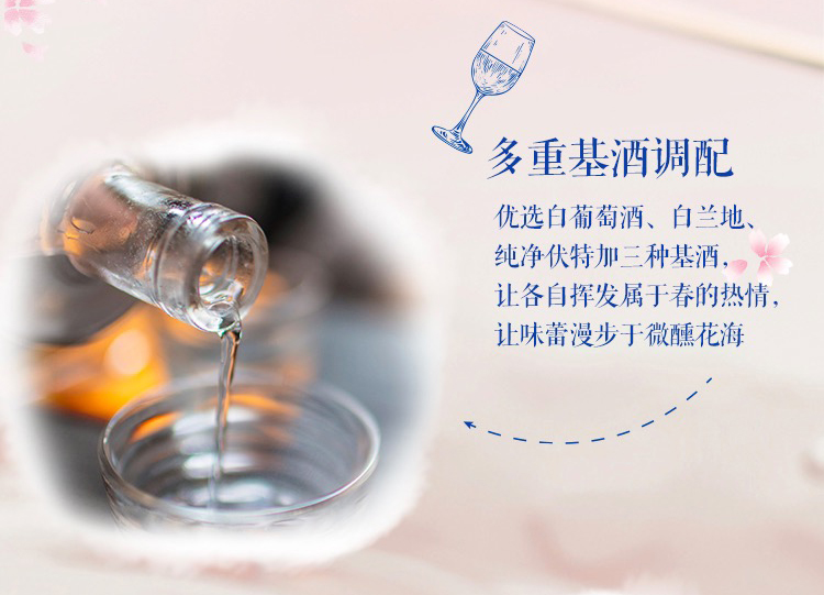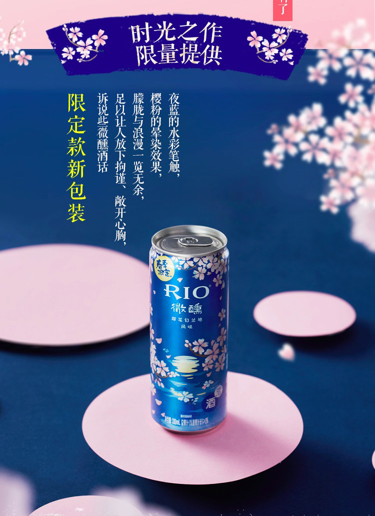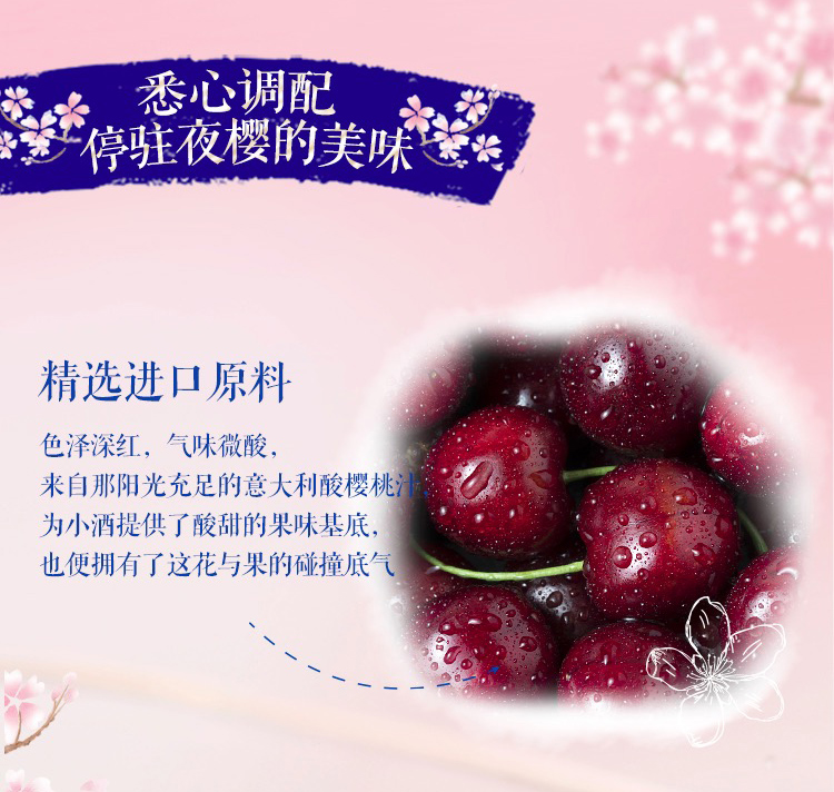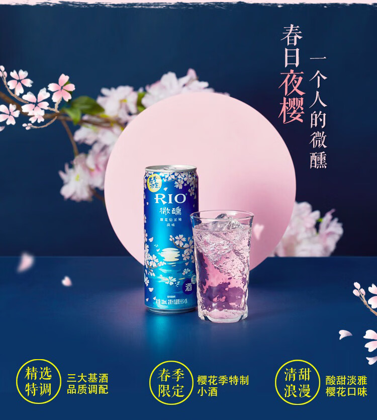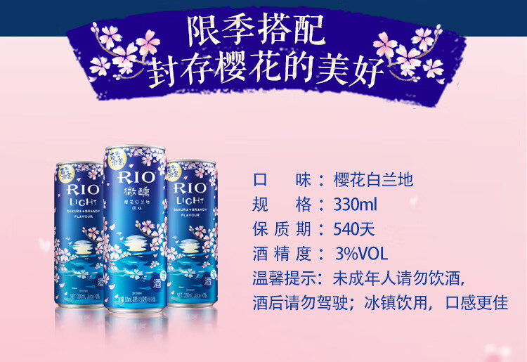 国产/进口:国产;产地:中国大陆;适用场景:家庭聚会,商务宴请,情侣约会,自斟自饮,亲友馈赠,闺蜜私语;包装:其它;容量:200-374mL;原料:水、白砂糖、果葡糖浆、食品添加剂、食用香精等;产地:中国大陆;保质期:540天;酒精度:3%vol;存储方法:请置于阴凉干燥处,避免高温和阳光直晒,禁止加热或0℃以下冷冻,切勿撞击。;包装:其它;容量:330mL;产品重量:2.85kg;包装清单:锐澳(RIO)洋酒 预调 鸡尾酒 微醺春季限定夜樱 樱花风味 3度 330ml*8罐;