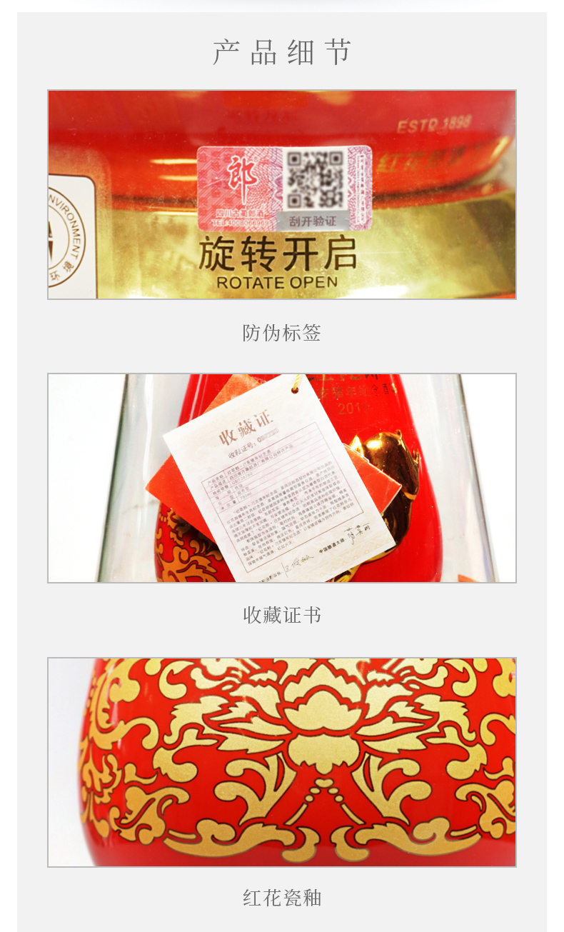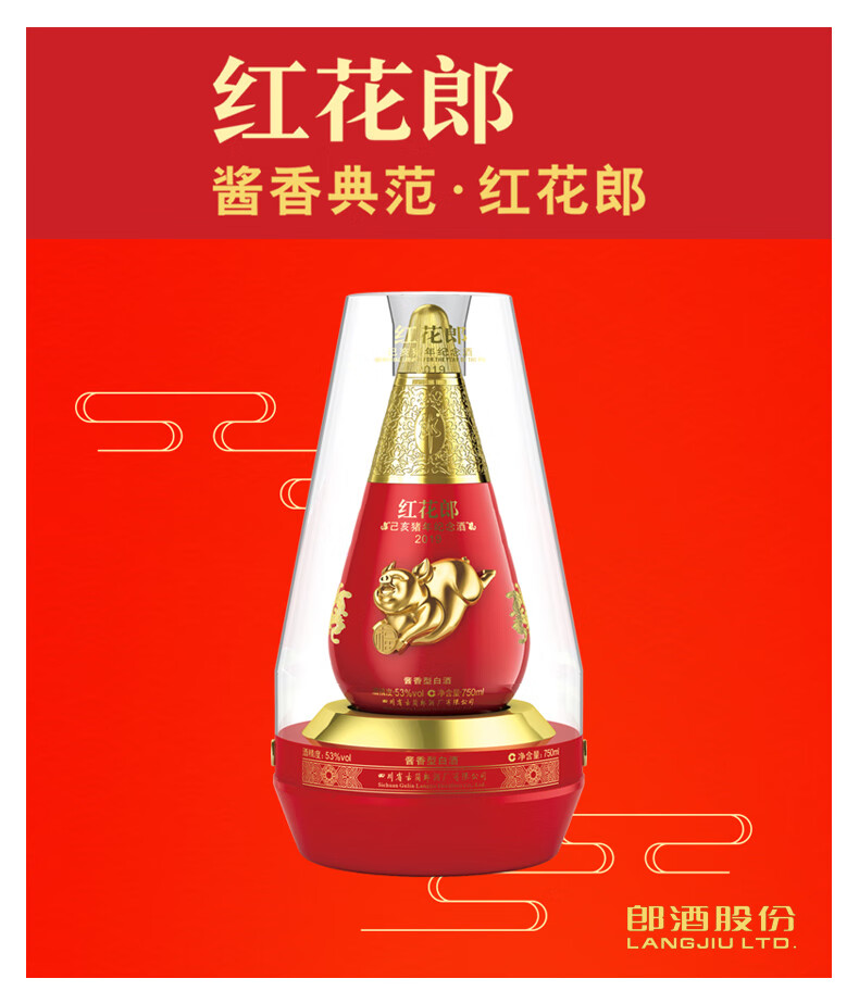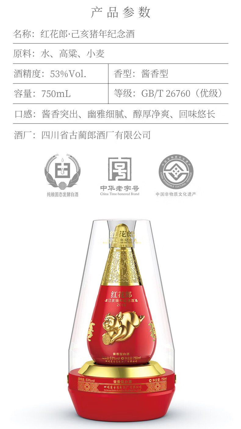 包装:瓶装;容量:750mL及以上;香型:酱香型;度数:50度及以上;产地:中国大陆;酒精度:53%vol;产品重量:2065g;容量:750ml;包装清单:郎酒红花郎猪年纪念酒53度750ml*1瓶;