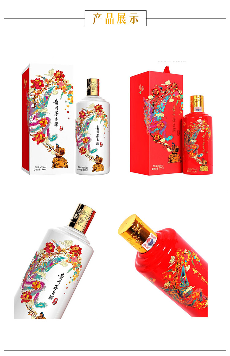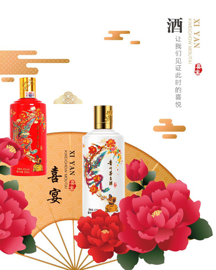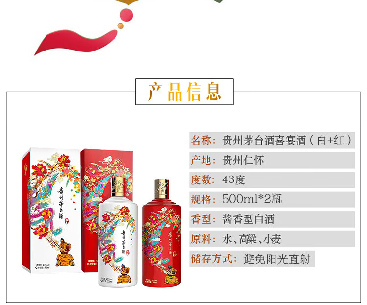 包装:其它;容量:500-749mL;香型:酱香型;产地:贵州;度数:40-49度;酒精度:43%vol;容量:500ml;产品重量:500g;包装清单:贵州茅台酒 喜宴(优雅白+中国红)43度 500ml*2 双瓶组合装 酱香型白酒 *1;