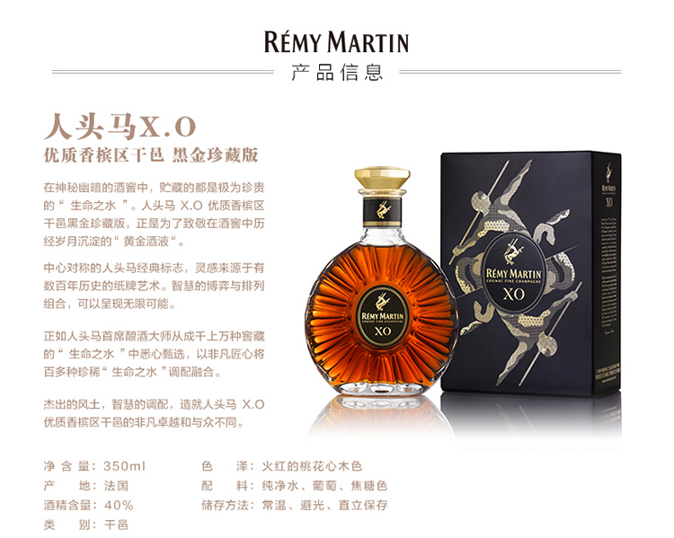 特性:XO;国产/进口:进口;产地:法国;适用场景:家庭聚会,商务宴请,情侣约会,自斟自饮,亲友馈赠,闺蜜私语;包装:瓶装;容量:200-374mL;酒精度:40;原料:葡萄、水、焦糖色;保质期:无保质期;产地:法国;特性:XO;存储方法:常温避光保存;容量:350ml;包装:单瓶;产品重量(kg):1.74;包装清单:X.O优质香槟区干邑白兰地 黑金珍藏版 350ml x1 包装盒 x1;