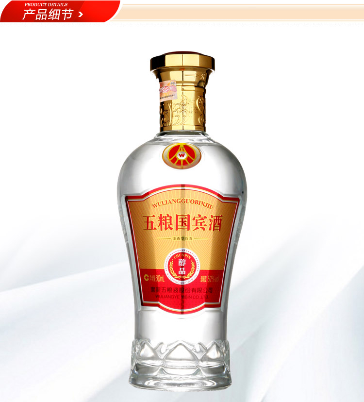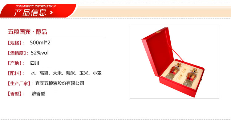 包装:礼盒装;容量:500-749mL;香型:浓香型;产地:四川;度数:50度及以上;酒精度:52%vol;容量:500ml*2瓶;产品重量:3760g;包装清单:五粮液股份公司出品 五粮国宾 52度 浓香型白酒 500ml *2瓶 礼盒装;