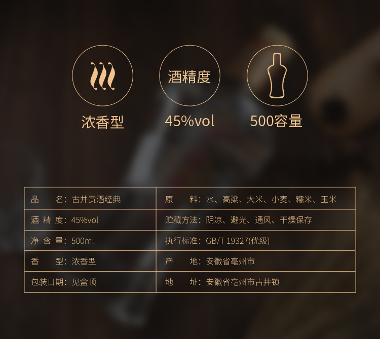 包装:整箱装;容量:376-499mL;香型:浓香型;产地:其它;度数:40-49度;酒精度:45%vol;容量:500ml;产品重量:8.07g;包装清单:古井贡酒 经典古井贡 45度整箱装白酒500ml*6瓶 口感浓香型;
