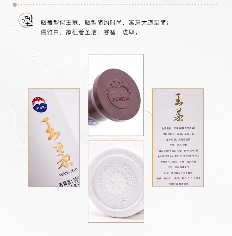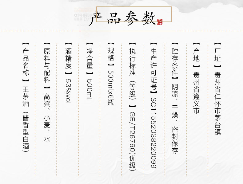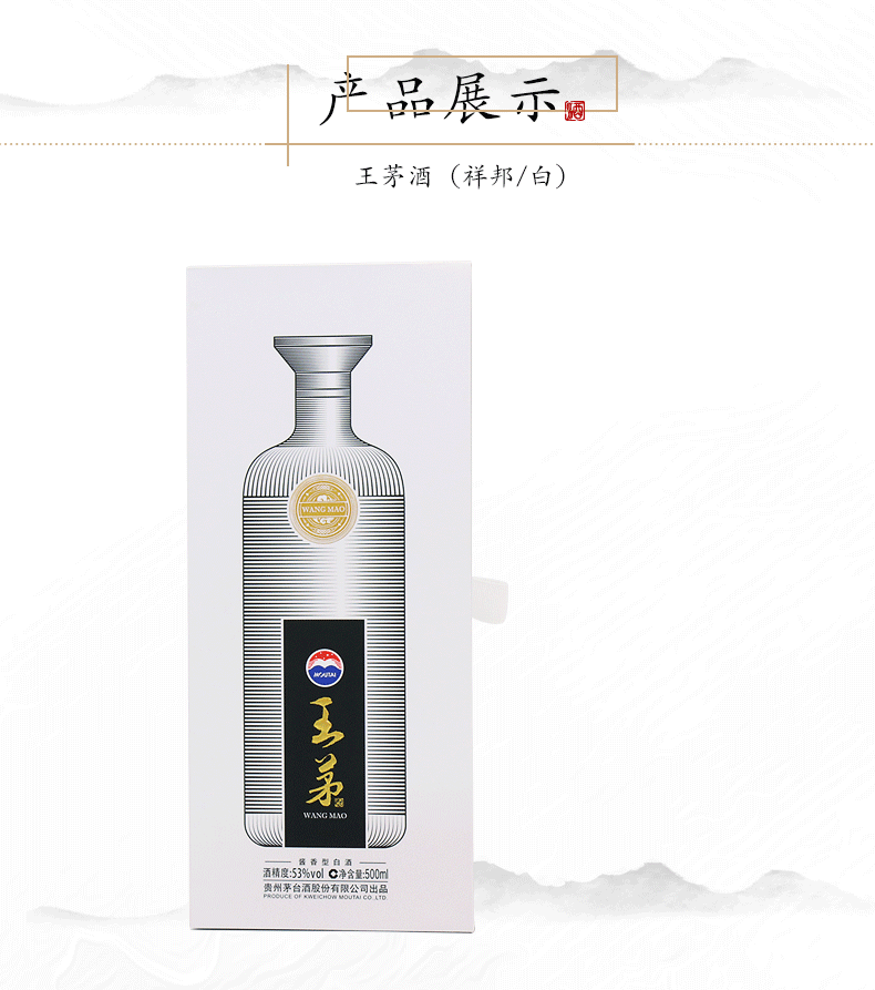 包装:整箱装;容量:500-749mL;香型:酱香型;产地:贵州;度数:50度及以上;酒精度:53%vol;容量:500ML;产品重量:9835g;包装清单:茅台 王茅 祥邦53度酱香型白酒 贵州茅台酒股份有限公司出品 500ml*6瓶整箱装 *1;