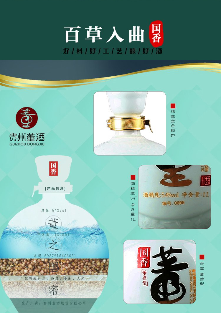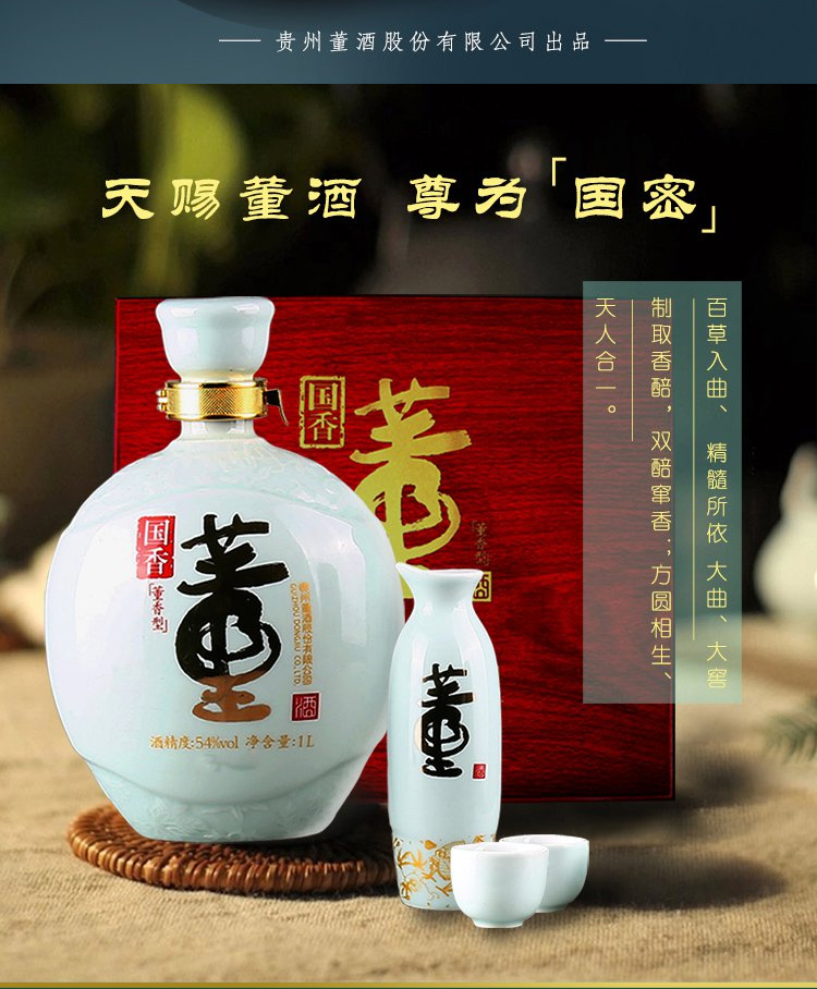 包装:礼盒装;容量:750mL及以上;香型:董香型;度数:50度及以上;香型:董香型;产地:贵州;酒精度:54%vol;包装:礼盒装;容量:1L;产品重量:4.61g;包装清单:董酒 白酒 国香 董香型 54度 1L 木质礼盒装*1;