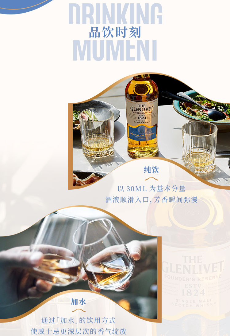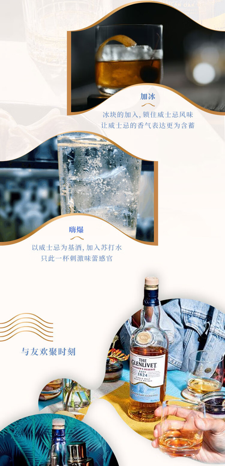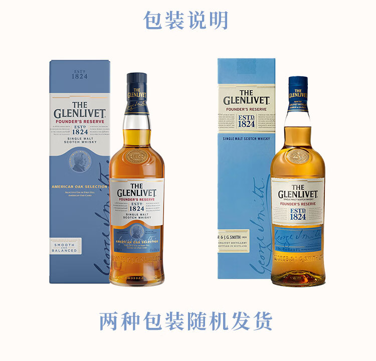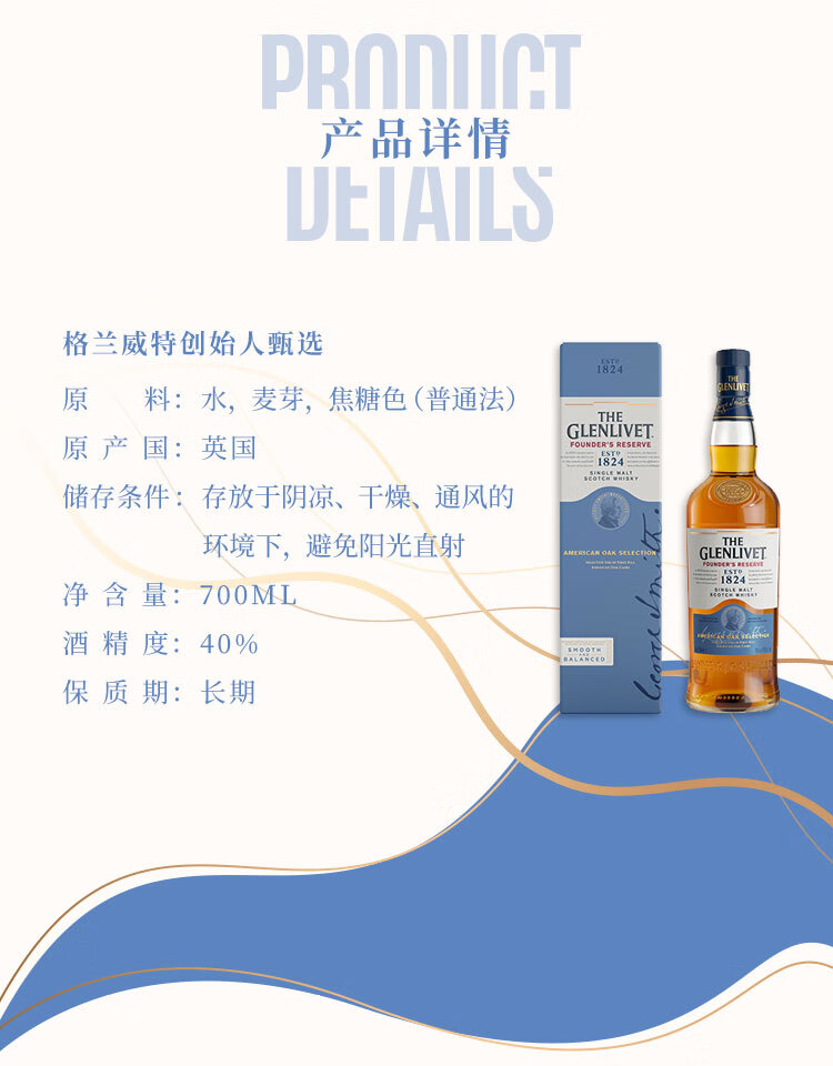 类型:单一麦芽威士忌;产地:苏格兰;适用场景:情侣约会,闺蜜私语,自斟自饮,亲友馈赠,家庭聚会,商务宴请;包装:瓶装;容量:700-999mL;阶段:小白入门;原料:水、麦芽、焦糖色;保质期:无;酒精度:40%vol;存储方法:常温避光;产品重量:1.36kg;容量:700mL;包装清单:格兰威特(Glenlivet)单一麦芽苏格兰威士忌创始人甄选系列 700ml;